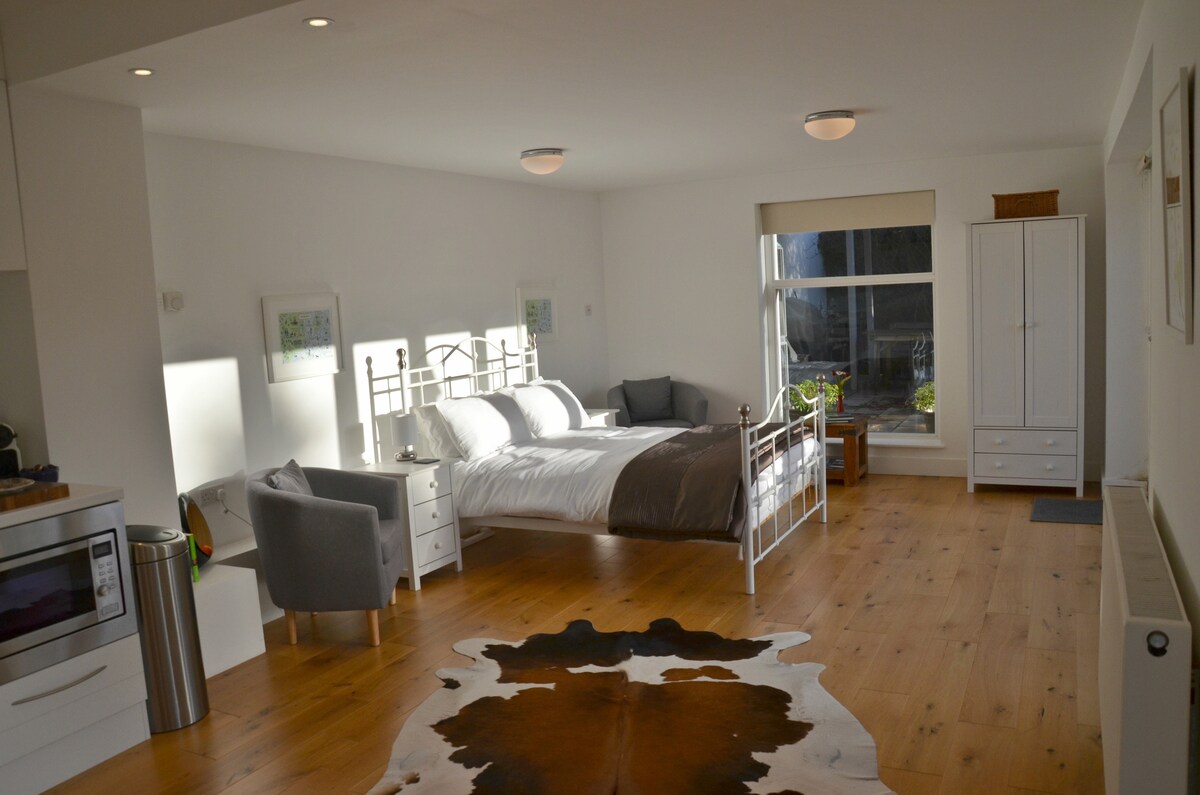 Estudio independiente luminoso y espacioso con cocina pequeña, ubicado en la parte trasera de nuestra casa familiar. Estamos a muy poca distancia a pie (5 minutos) de la entrada principal del All England Club (que se puede ver desde la propiedad), el Wimbledon Club, el parque de Wimbledon y el parque de Wimbledon Common. El estudio tiene vistas a nuestro jardín y patio maduros que los huéspedes pueden usar y disfrutar durante su estadía.