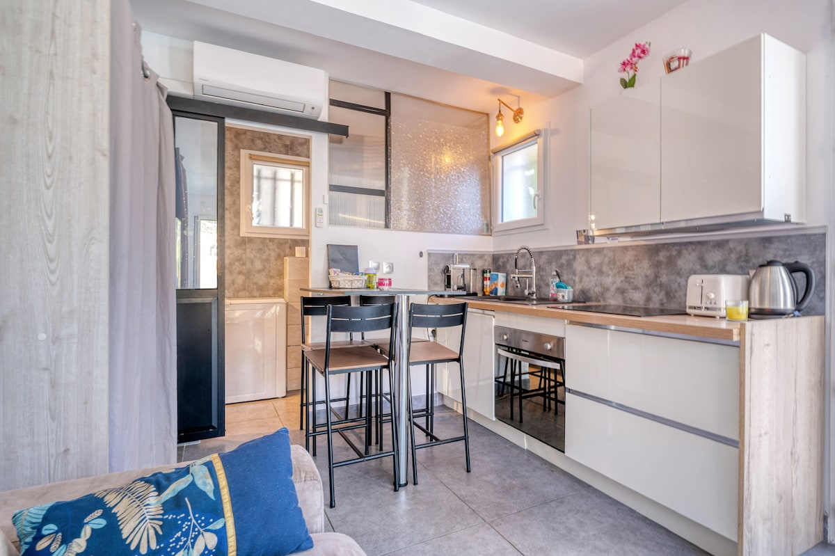 Estudio nuevo de 22 m2 en casa nueva. AIRE ACONDICIONADO, NETFLIX DISNEY+ CON ACCESO INDEPENDIENTE 500 m al aire libre barbacoa, piscina y sala de estar al aire libre INDEPENDIENTE Las actividades del trampolín, el torniquete se comparten con los hijos de los propietarios Una verdadera cama de 140 por 200 con ropa de cama nueva Un sofá poltronesofa convertible nuevo Cocina totalmente equipada ( horno, placa, nevera grande con congelador, con Nespresso) Y gran baño cerrado con lavadora