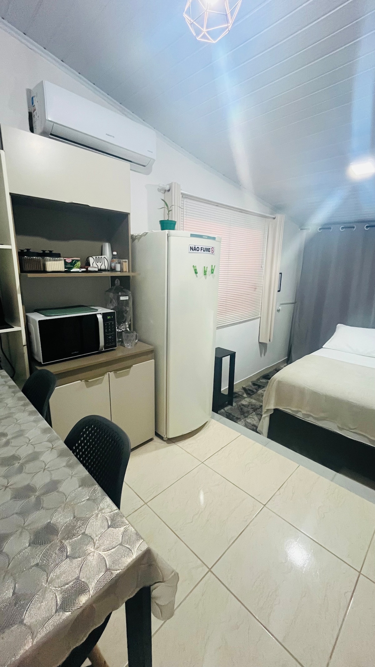 Tómate un descanso para relajarte en esta acogedora cama con entrada independiente, con una habitación con aire acondicionado, baño, amplia sala de estar y cocina integrada con aire acondicionado. A 500 metros de la playa de Cabeçudas, uno de los mejores barrios de la ciudad de Itajaí SC. Tiene una cama doble en el dormitorio, una cama doble y un sofá cama en la sala de estar, y un colchón doble adicional.