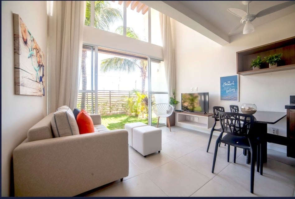 Condominio junto al mar con piscina, gimnasio, canchas y seguridad las 24 horas. Bungalow de 3 habitaciones (1 con cama tamaño queen e individual, 1 con cama tamaño queen y 1 con cama doble e individual), con capacidad para hasta 8 personas. Cocina completa, aire acondicionado, lavadora y secadora, toallas y ropa de cama. Para que tu estancia sea inolvidable, hemos incluido en los servicios diarios de Rosy que con tus habilidades culinarias y tu disposición para ayudar con cualquier necesidad harán que tu viaje sea más práctico y cómodo.