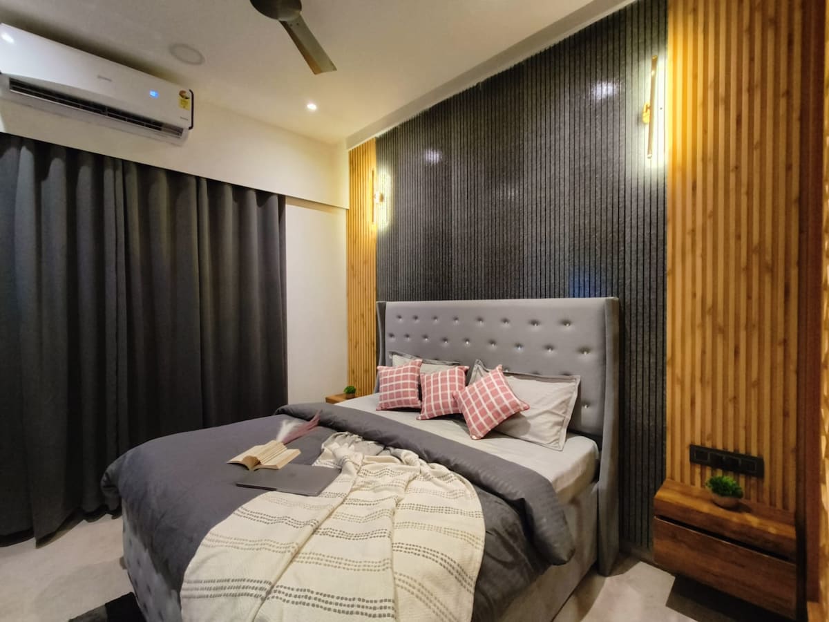 El primer apartamento de 2 Bhk que cumple con todos los requisitos ✨ - 2 dormitorios ( dormitorio principal, segundo dormitorio). - Dos camas tamaño king. - Una amplia sala de estar con una cómoda disposición de asientos. - 2 baños ( 1 en cada uno de los dormitorios). - Cocina pequeña (con todos los utensilios básicos de cocina disponibles y servicios abastecidos, es el lugar perfecto para preparar tus comidas favoritas) - Una zona de balcón compartido que conecta con el apartamento, que puede ser el espacio perfecto para tus paseos nocturnos. ¡Reserva ahora!