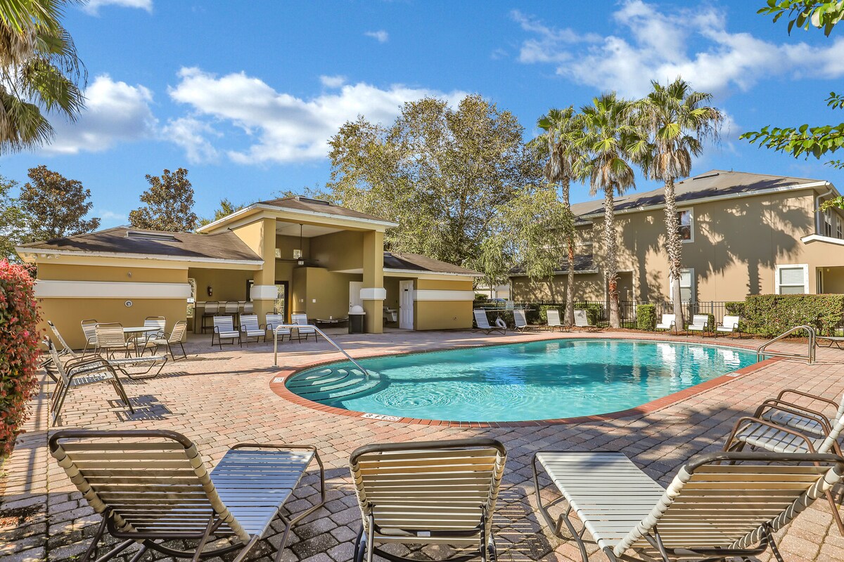 ¡Amplio condominio de 2 dormitorios y 2 baños a solo 10 minutos de Mayo Clinic y Town Center! Cada suite King tiene baño privado, vestidor y TV inteligente. Disfruta de wifi gratis, lavandería en la unidad y comodidades completas de estilo resort: piscina, gimnasio y más. Ubicado en un edificio seguro con ascensor y estacionamiento gratuito. Perfecto para estadías médicas o visitas prolongadas. Relájate con comodidad, explora los restaurantes y tiendas cercanos o dirígete a la playa a solo 15 minutos. Fácil acceso a la I-295 hace que todo esté a tu alcance.