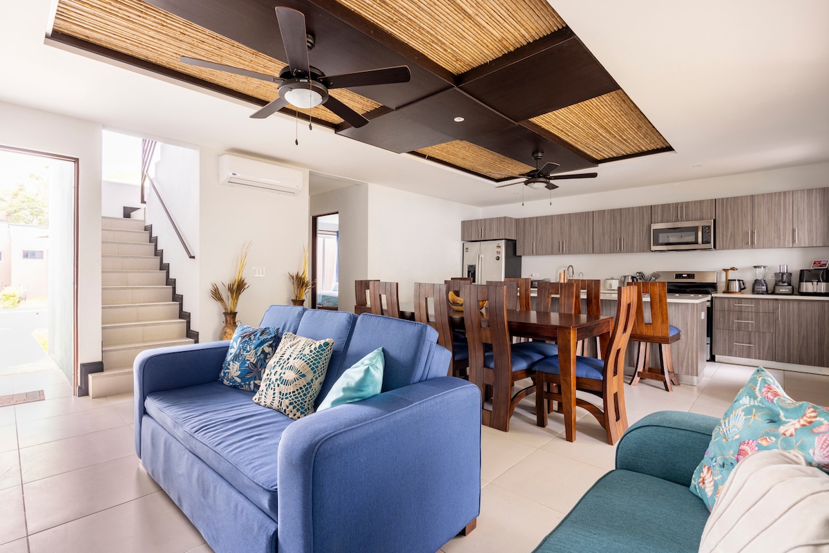 ¡Este nuevo hogar, desarrollado con un diseño arquitectónico moderno, una planta abierta y un 50 % de zonas verdes, te espera! A solo 600 metros de la playa (10 min). La casa tiene 3 dormitorios totalmente amueblados con muebles únicos y personalizados hechos a mano por hábiles artesanos costarricenses. Tiene una piscina privada y es la ÚNICA casa con un patio/terraza trasero privado para reuniones. Esta es una comunidad cerrada con guardias de seguridad las 24 horas los siete días de la semana. Esta casa te hará sentir como en casa, seguro y relajado. ¡Disfruta de tu visita!