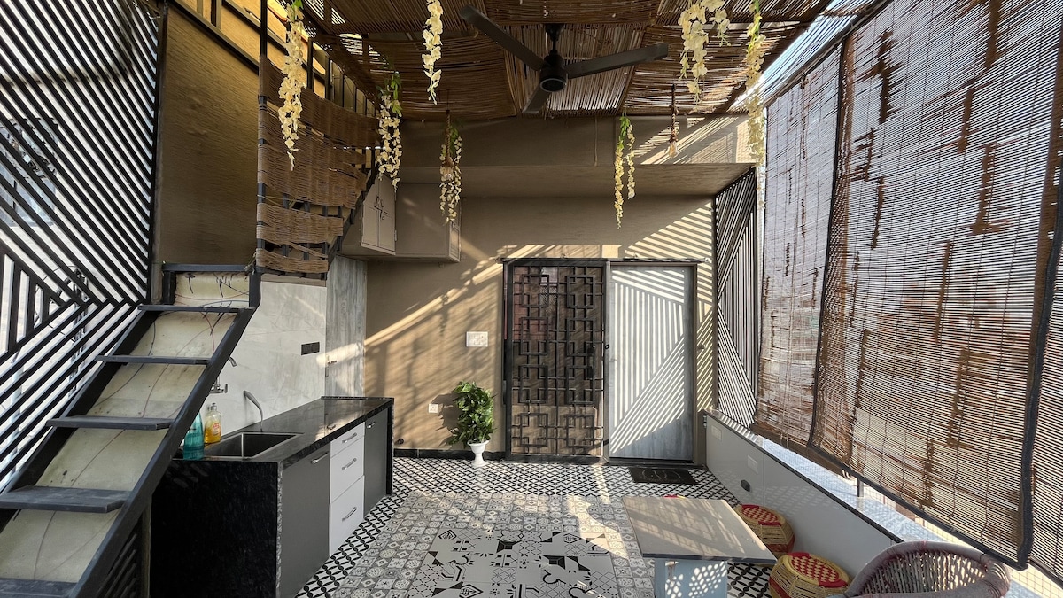 Discover our newly built, bright and spacious 1 Bedroom modern apartment near airport, with stylish decor, open space and a private open terrace with gazebo. * Enjoy a fully equipped Kitchen. * An open terrace for morning coffee and evening fun. * Located in a Vibrant area with cafés and essentials nearby. * Just 10 mins from the Jaipur International Airport. * Situated in a safe, upscale neighbourhood with food delivery options available. —————————————————————