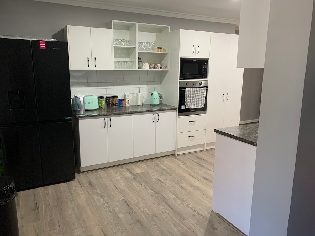 This is a fully self contained private Studio Apartment. It is part of an enormous house which consists of Merino Manor, 3br unit plus Perendale Penthouse, 4br unit. Combined the three units can accomodate 22 guests It has a well set up kitchen with pantry, four element electric stove, good sized fridge and freezer, large comfy lounge and enough crockery and cutlery to cater for up to six people in case you have visitors call in.