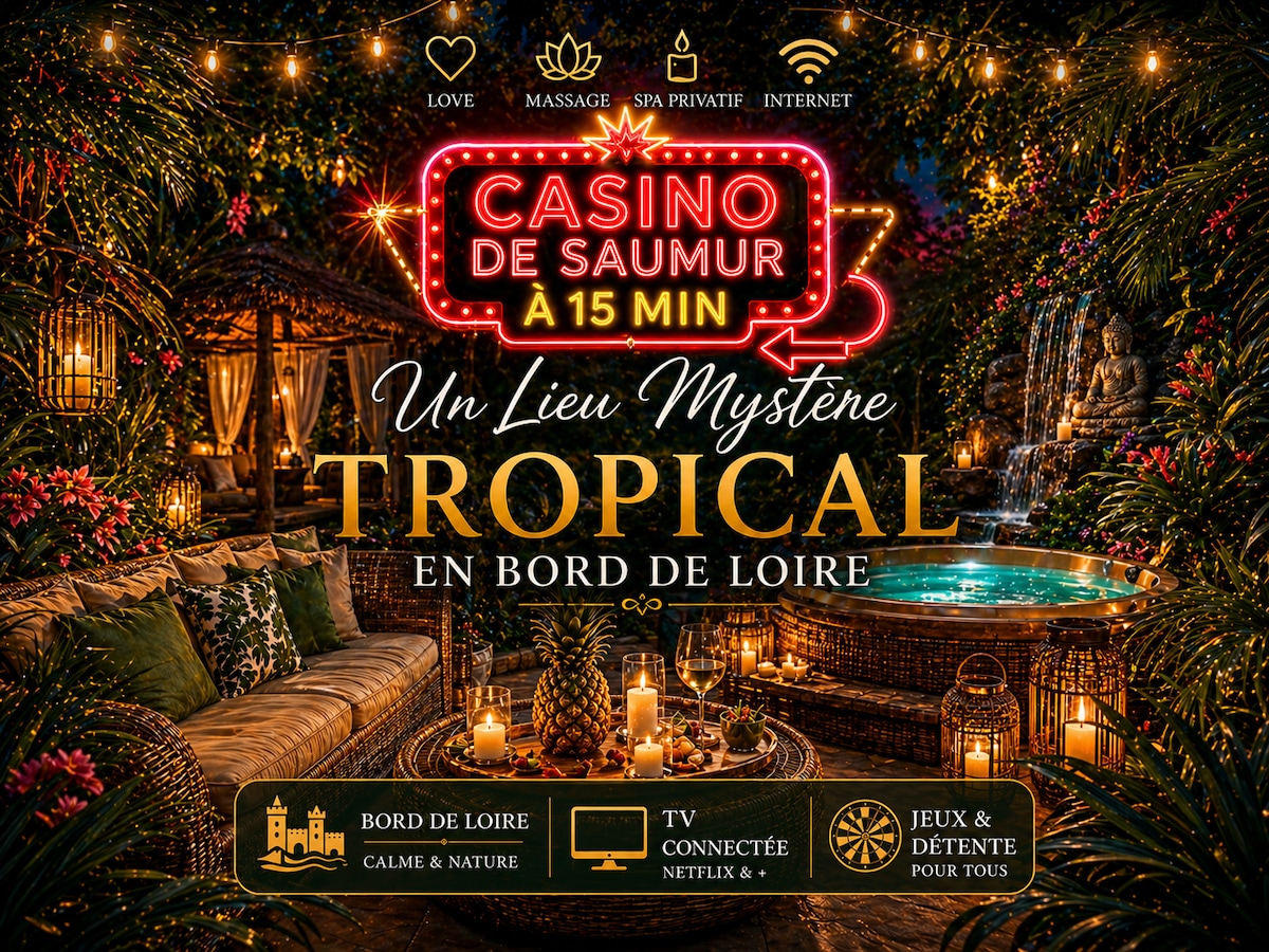 ✨ Descubre el Mirage Tropical, un paréntesis refinado a orillas del Loira 🌴. Disfrute de un spa, una mesa de masajes, una elegante terraza y un exótico espacio selvático para escapar. Diviértase jugando a los dardos, comparta un aperitivo exótico o relájese en un ambiente único. Por la noche, la habitación se ilumina con colores cautivadores para un momento elegante y romántico💖. Aquí, cada detalle sublima su estadía para crear recuerdos memorables.🌴❤️❤️💕💕💕👄🫂❤️