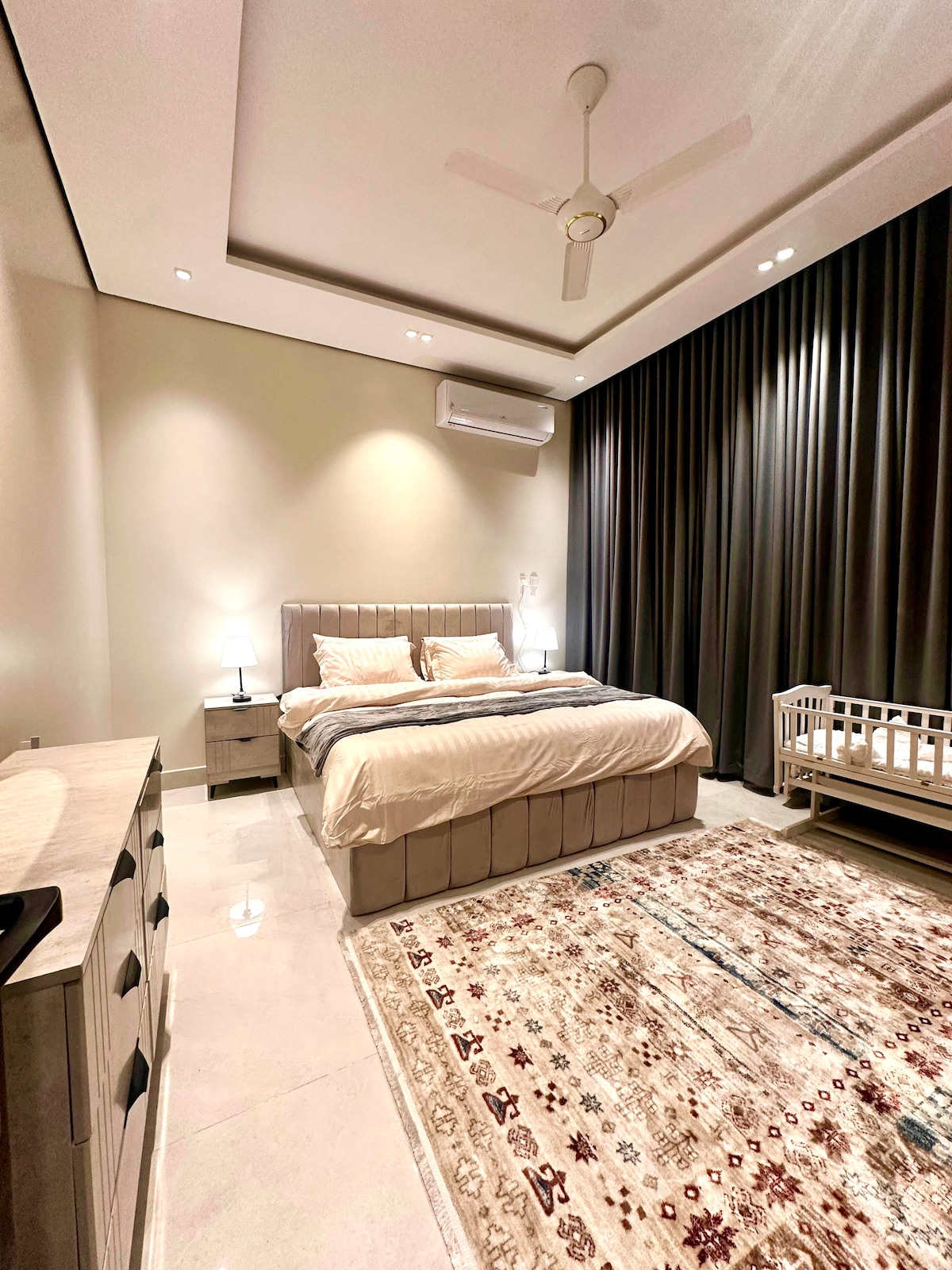 Amplio y elegante apartamento con registro de entrada inteligente, entrada independiente y estacionamiento privado. Cuenta con dos dormitorios equipados con cómodas camas, muebles que satisfacen las necesidades de la familia o un grupo de amigos. Equipado con un sofá y una mesa para sentarse y relajarse, con la posibilidad de utilizar el sofá como cama supletoria cuando sea necesario. A menos de 5 minutos de North Corniche y la Universidad de Jazan, el apartamento tiene capacidad para 5 personas. No se permite fumar en el departamento, tarifa por fumar 100 riales