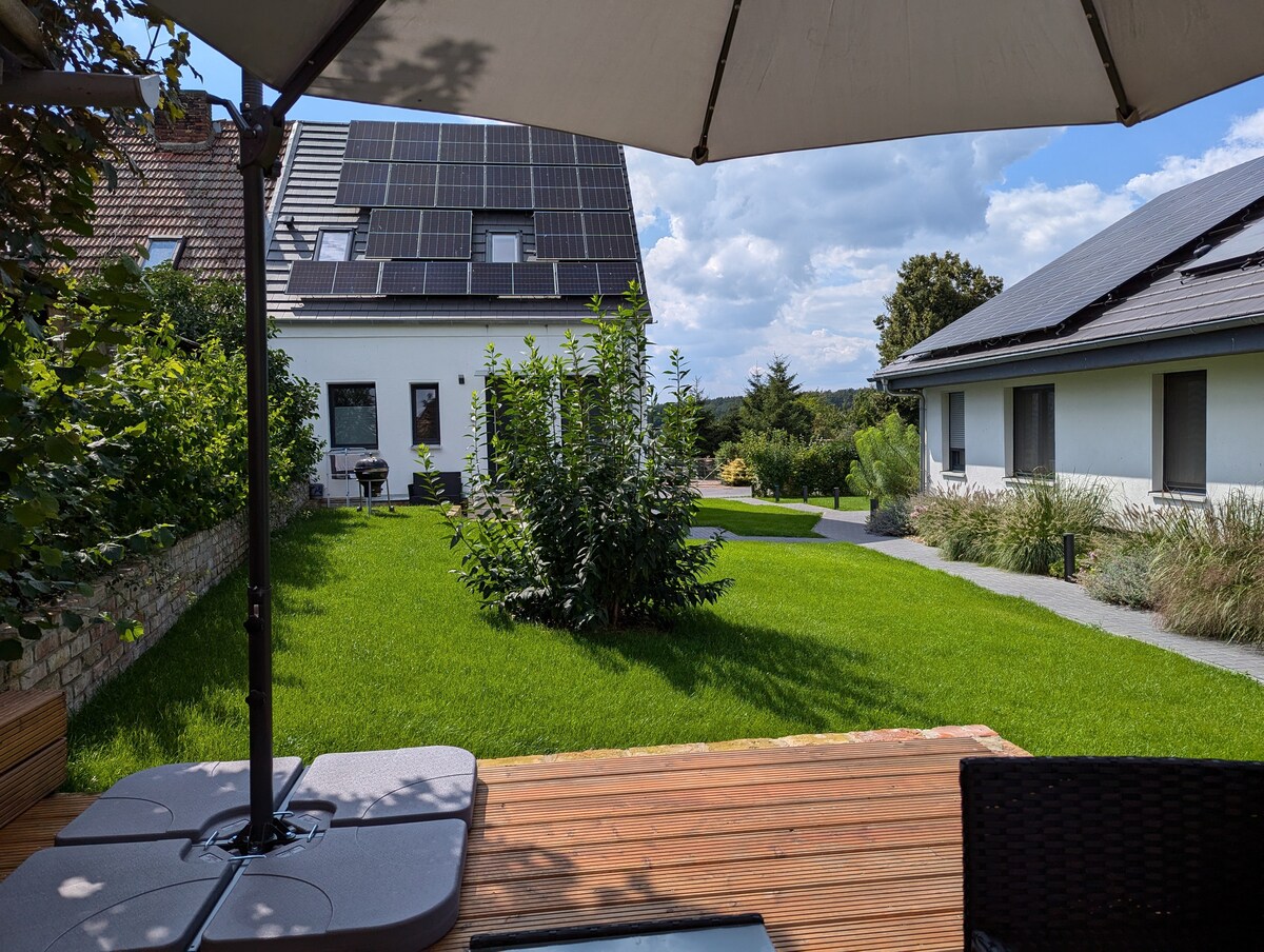 Siéntate y relájate en este alojamiento tranquilo y elegante en medio del campo. Disfruta de las cálidas noches de verano en la terraza o de las frescas noches de otoño e invierno frente a la chimenea. Despiértate con el canto de los pájaros en los árboles y explora los alrededores rurales cercanos o el carril bici del Elba a pie o en bicicleta. Pasea por los parques de la antigua exposición de jardines estatales en la pequeña ciudad de Burg, a solo 4 km de distancia, y disfruta de un concierto al aire libre en el pintoresco viñedo.