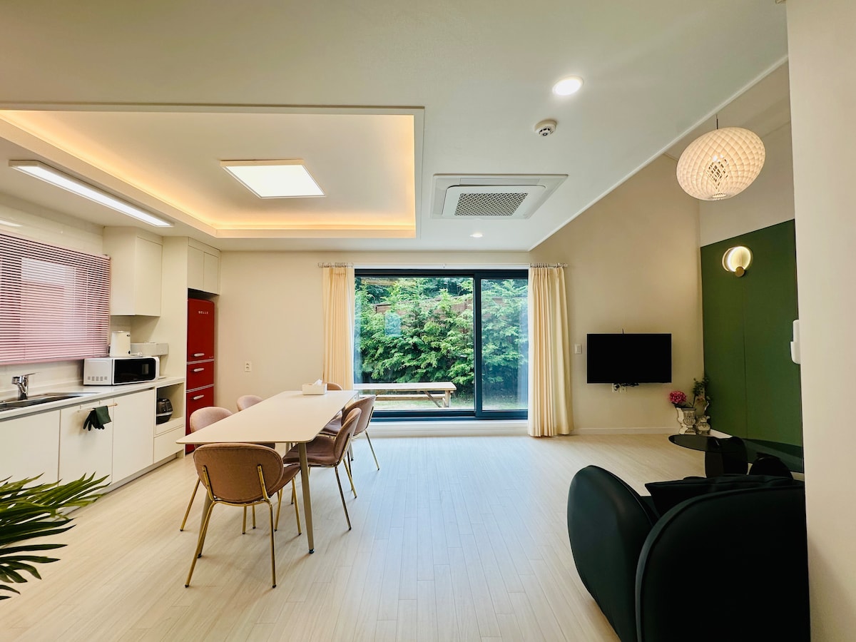 • Máximo 2 personas, incluidos adultos y niños (bebés y niños pequeños). • Pensión tranquila con un diseño de un famoso arquitecto y una decoración blanca • Vista panorámica del mar lejano y del cedro (la vista del jardín puede ser diferente a la de la foto). • Cama queen size (ropa de cama adicional es un servicio de pago) • La ubicación de la sala de estar y el dormitorio cambia durante el invierno. • Cocina (no se permite asar) y comedor en la habitación con posibilidad de cocinar sencillo • Jardín privado, ducha y baño • Inducción, caldera eléctrica (sin instalación de gas) • Desayuno: el café ofrece un desayuno sencillo (tostadas y zumos) • No se permite hacer barbacoas. • Transporte: 10 minutos en coche a Jungmun, 15 minutos a Seogwipo, 30 minutos a Hallasan Yeongsil Coast, 50 minutos al aeropuerto, 4 minutos a pie desde la parada del autobús del aeropuerto