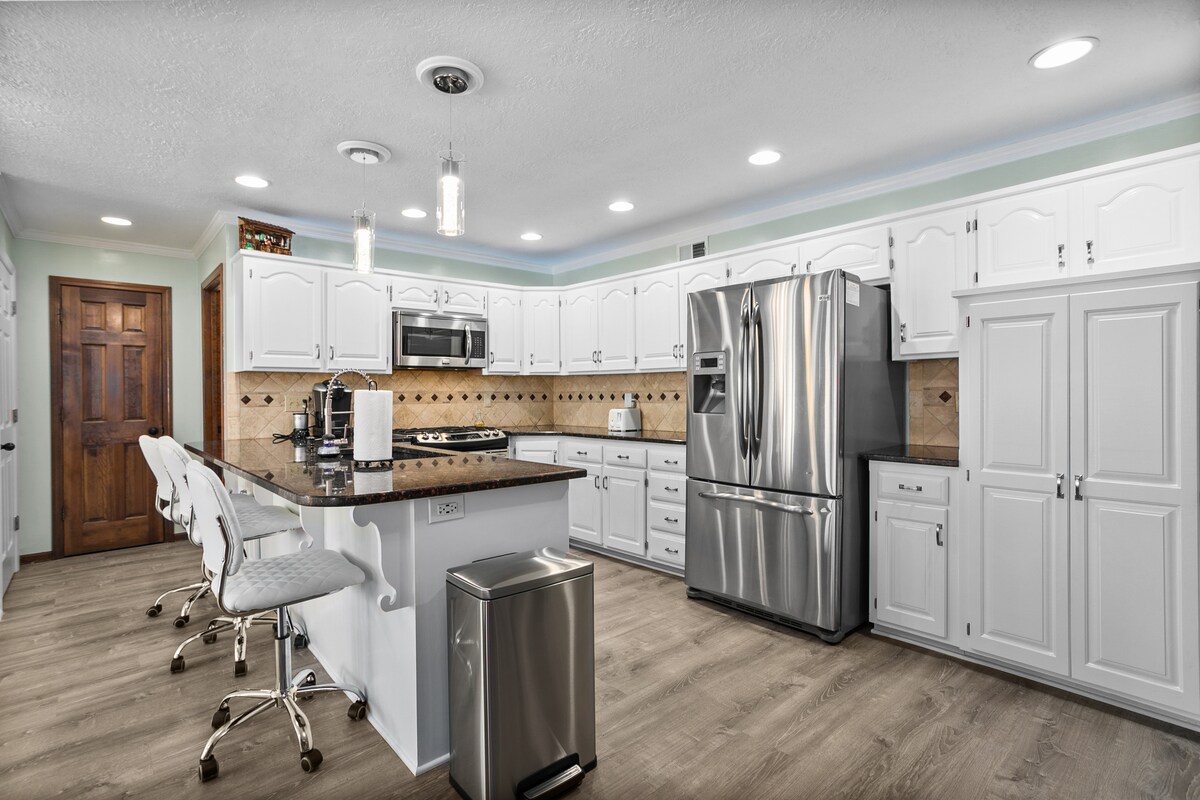 ¡Relájate y tómate un descanso en este espacioso refugio familiar! Echa un vistazo al gran espacio al aire libre con jacuzzi para 8 personas, chimenea y un patio tranquilo. ¡Relájate en el interior en el sofá de 12' y ve tu película favorita en una pantalla de 150"! ¡A los niños pequeños les encantará columpiarse en el patio trasero o escalar en el barco pirata de 25' y el castillo de dos pisos! ¡La mesa de billar en la sala de juegos es ideal para todas las edades! Todas las habitaciones cuentan con ropa de cama de felpa, colchones de alta calidad y televisores inteligentes. Cubiertos y utensilios de cocina completos.