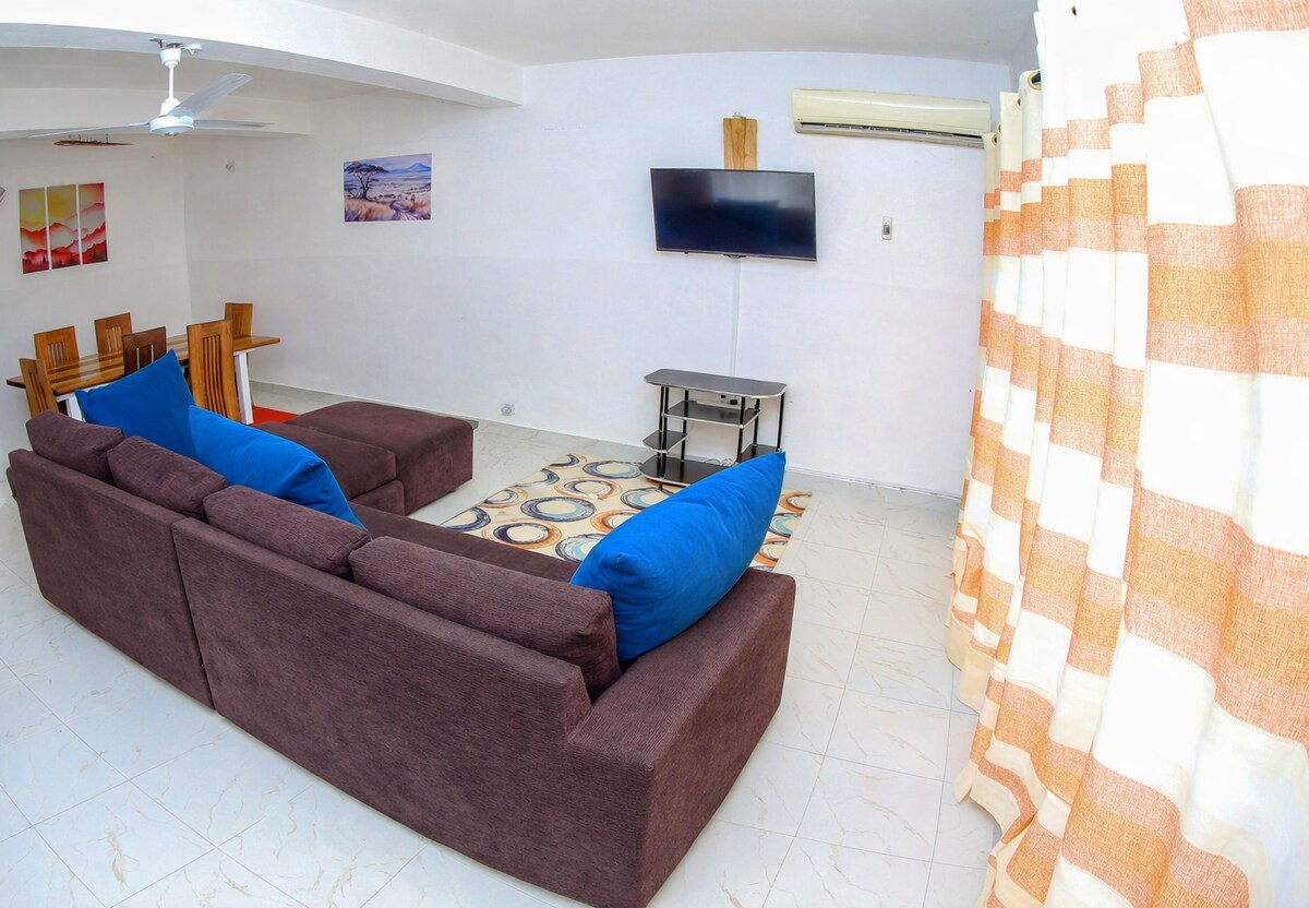 Relájate con toda la familia en este tranquilo apartamento frente a la playa, ubicado en la planta baja. La casa tiene capacidad para 6 personas como máximo. La playa está a pocos pasos y los centros comerciales están cerca, como a 8 minutos. Nuestra cocina está totalmente equipada. Aire acondicionado en 2 habitaciones por un cargo adicional de 1500 ksh por estancia. Para los padres con niños pequeños, nuestro espacio al aire libre es lo suficientemente amplio como para que los niños jueguen libremente. Estamos justo al lado del restaurante Toscana Beach y tenemos contactos para la entrega de alimentos justo en nuestra puerta.