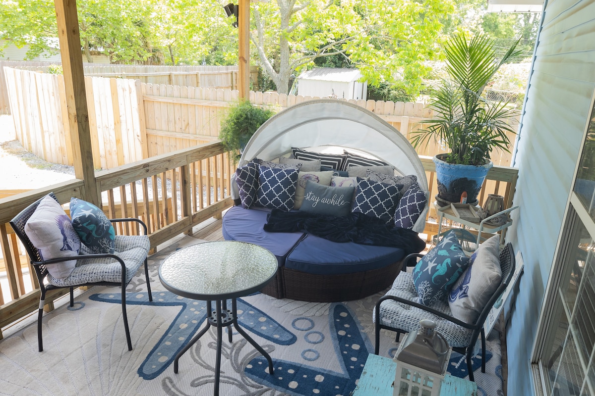 Come and make memories in this unique and family-friendly home located in a peacefully quite neighborhood. Relax in our cozy and colorful home and lounge on our new furniture. Enjoy fiber optic internet. Hang outside and bbq in our screened-in porch, or gather with your friends and family in the backyard and fire up the firepit! Plus, you'll only be a few driving minutes away from the beach, the aquarium, or you can just walk across the street to the local park and tennis courts!