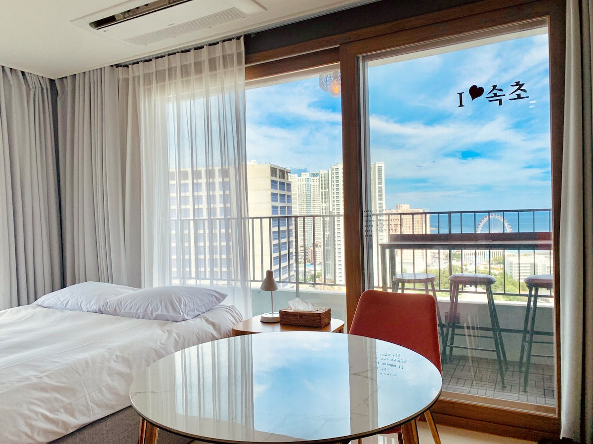 Hotel de nueva construcción/Vista al mar y a la montaña/Balcón en habitación de 1,5 pisos/7 minutos a pie de la playa de Sokcho/Televisor 4K de 50 pulgadas