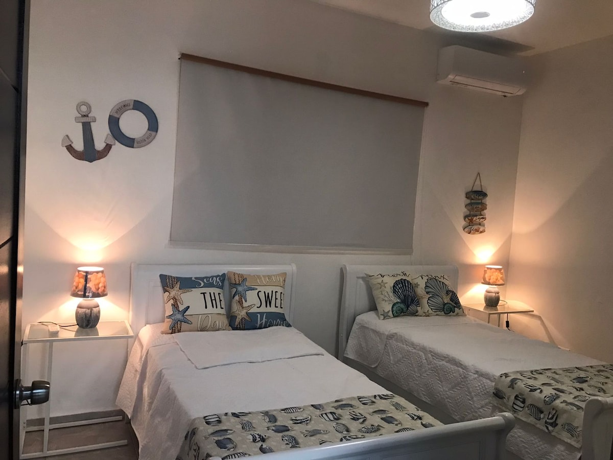 Cuenta con dos comodas habitaciones, una confortable cama Queen en habitacion principal ademas de contar con su bano y un espacioso closet , la segunda habitacion con dos suaves camas tamaño Queen y un espacioso closet. un segundo bano, espaciosa, comoda y hermosa sala de estar, cocina equipada con utensilios utiles y necesarios, area de lavado y secado, aire central, su balcon que nos permite disfrutar de hermosas mañana y fantásticos aterdeceres.