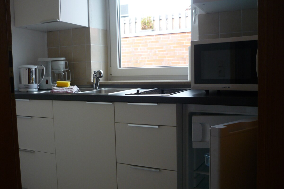 El bonito apartamento de 1 habitación con decoración moderna tiene una entrada independiente, una cama grande (140x200 cm), sofá, armario blanco de Ikea, mesa de comedor con 2 sillas, televisor de pantalla plana, cocina con microondas (aire caliente), cafetera, Tchibo Cafissimo, tostadora, hervidor de agua, vajilla, baño, ducha, armario con espejos, mueble bajo lavabo, conexión a Internet, persianas eléctricas en el salón/dormitorio y en el baño. Se proporciona secador de pelo, jabón de manos, champú, toallas y ropa de cama.