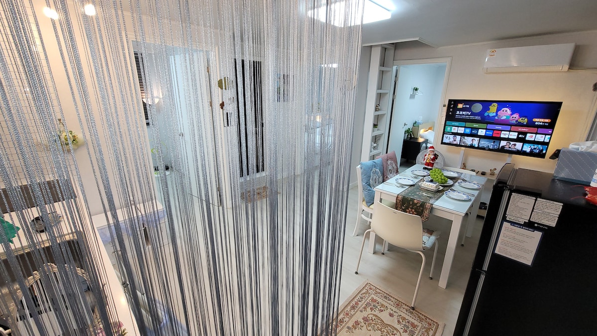 Remodeled! (June 25) Use the entire 2F : living room, kitchen, 3bed room(Max 7beds), 1.5bathrooms (1Toilet, 2Shower), terrace Location : 2minutes on foot from subway Station(1stop from Seoul Station), Many restaurants and stores nearby High quality bedding : thick&springy mattress, 100% cotton pads will guide you into a deep sleep. Good for long stay : 120inch TV, water purifier, washing machine&dryer, LG aircon, dyson hair dryer, vacuum, iron Storage of luggage : in 2F hallway (safe space)
