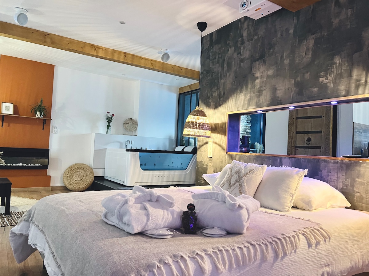 Disfrute de un paréntesis para dos en este alojamiento íntimo y cálido. Decoración elegante, ambiente cálido y todas las comodidades necesarias para una estadía bajo el signo de la relajación y la complicidad. Ideal para una noche romántica, un cumpleaños o una sorpresa amorosa. Posibilidad de desayuno bajo petición pero también pierrade y/o raclette. Posibilidad de decoración romántica con ramo de flores y botella de champán de calidad.