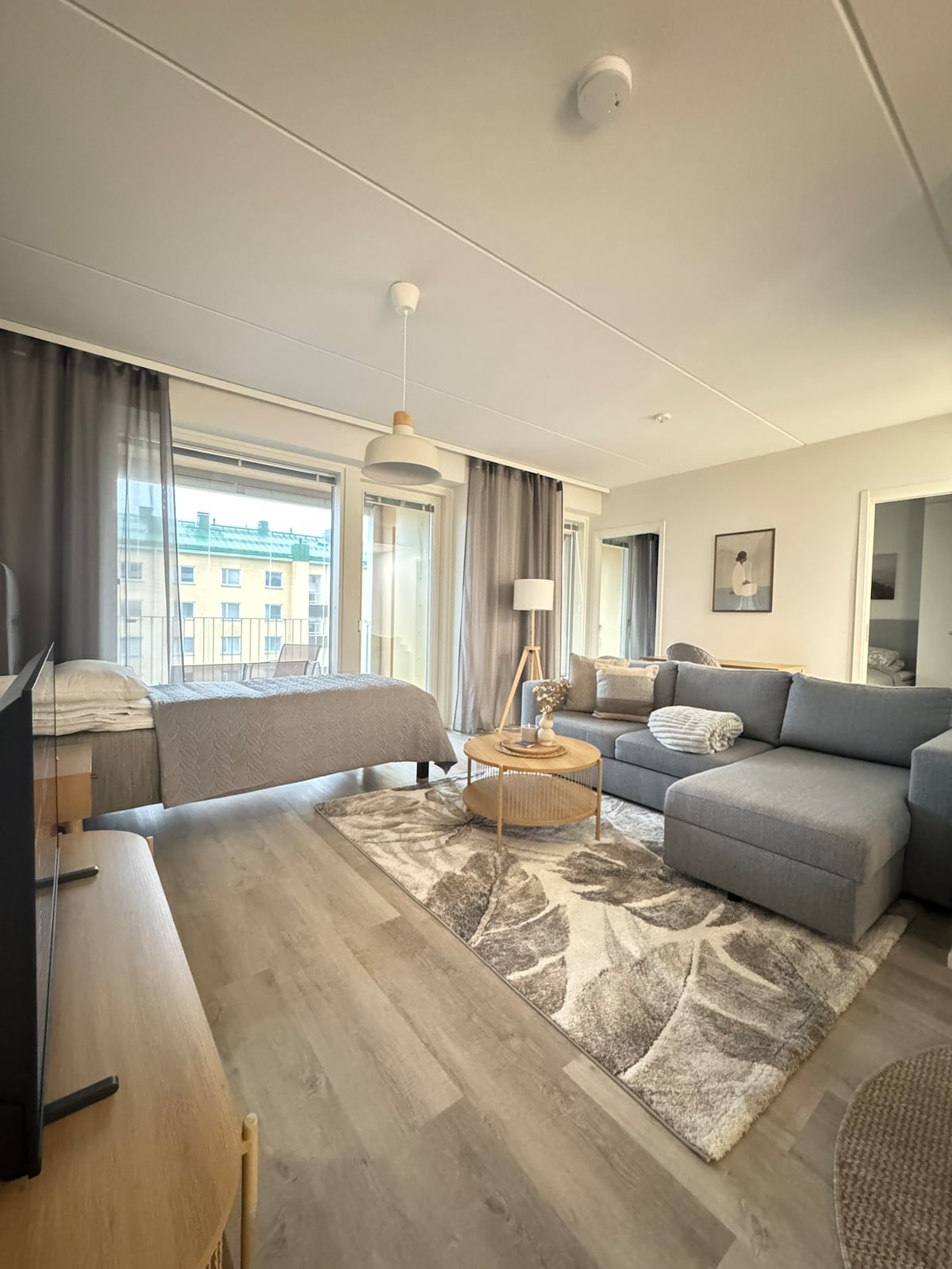 Un espacioso apartamento de 55 m2 con una elegante sauna y un gran balcón acristalado con vistas a la ciudad. Está ubicado en el quinto piso de una casa con ascensor. El departamento cuenta con lavadora, por lo que también es adecuado para alojamientos de larga duración. Restaurantes, eventos, estación de tren y autobús a un paso de distancia. El departamento tiene una cama doble de 160x200, una cama de marco de 90x200 y un sofá cama de 140x200 para dos personas, por lo que el alojamiento también es adecuado para un grupo más grande.