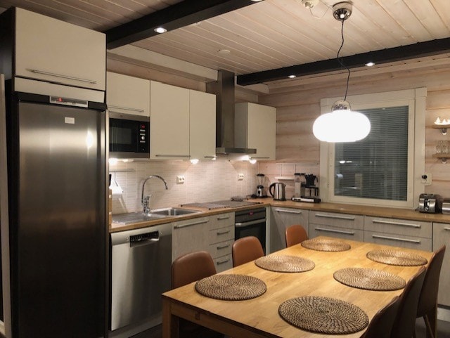 Disfruta del encanto de Laponia en esta casa de troncos totalmente renovada y acogedora, perfecta para familias o grupos. Lujosa y con una ubicación ideal, ofrece impresionantes vistas al Ártico y está a poca distancia a pie de las tiendas, restaurantes, actividades y los mejores lugares para ver auroras boreales de Saariselkä. También se puede llegar fácilmente en avión o tren. ¡Estaremos encantados de ayudarte con todos los aspectos de tu estancia! Incluye sauna, dos chimeneas, wifi, Netflix y plaza de aparcamiento.