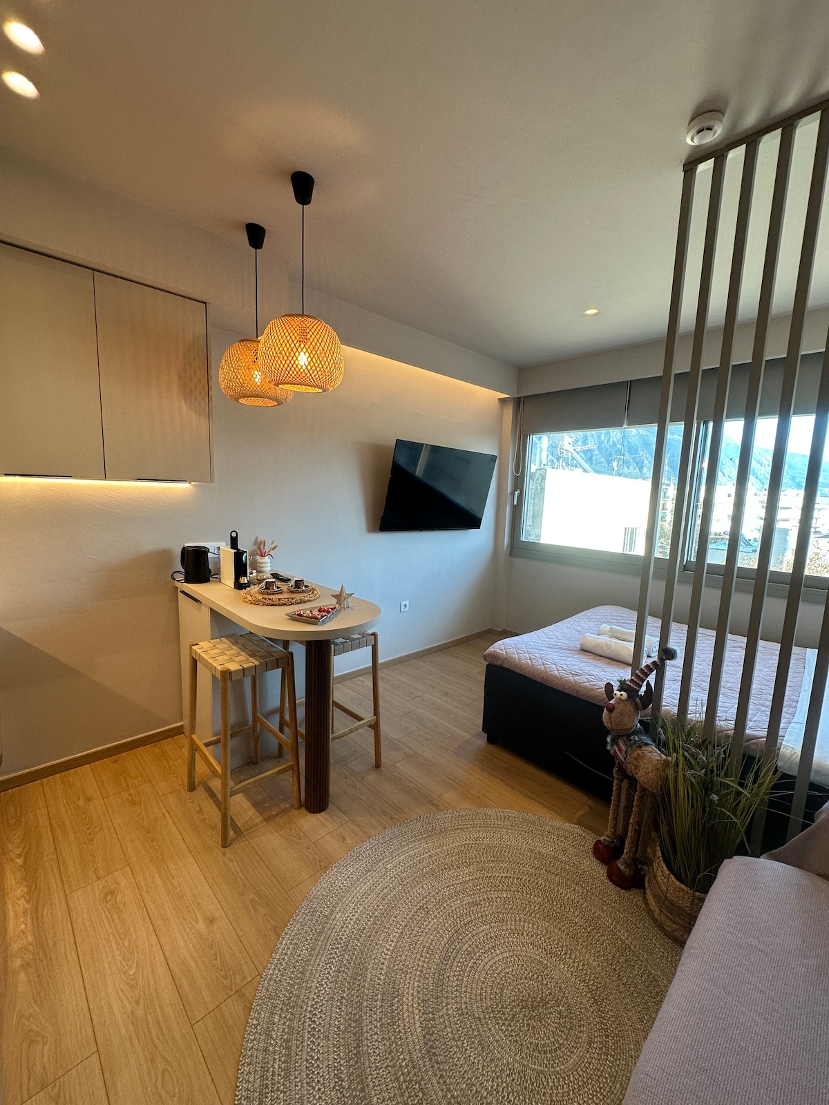 Disfrute de su estancia en un apartamento elegante, moderno y completamente renovado en el cuarto piso de un edificio de 5 plantas en el corazón de la ciudad de Kalamata. Dispone de: 1 dormitorio con cama de matrimonio y TV. Amplio salón con 1 sofá cama, TV Cocina totalmente equipada con comedor, cocina eléctrica, nevera, utensilios de cocina y vajilla. Baño con ducha y lavadora Balcón con vistas a la plaza central de Kalamata.