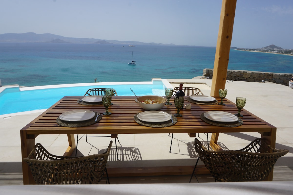 Villa Arismari se encuentra en una ladera serena, rodeada de rocas naturales, con vistas a la hermosa costa de Orkos. Tenemos una impresionante vista panorámica al mar Egeo y a nuestra isla vecina de Paros. Estamos situados entre la playa principal y las bahías más pequeñas de Orkos. Mientras disfrutas de las vistas que ofrece Villa Arismari, prepárate para hacerte unos selfies increíbles. Villa Arismari es una villa de diseño minimalista cicládico.