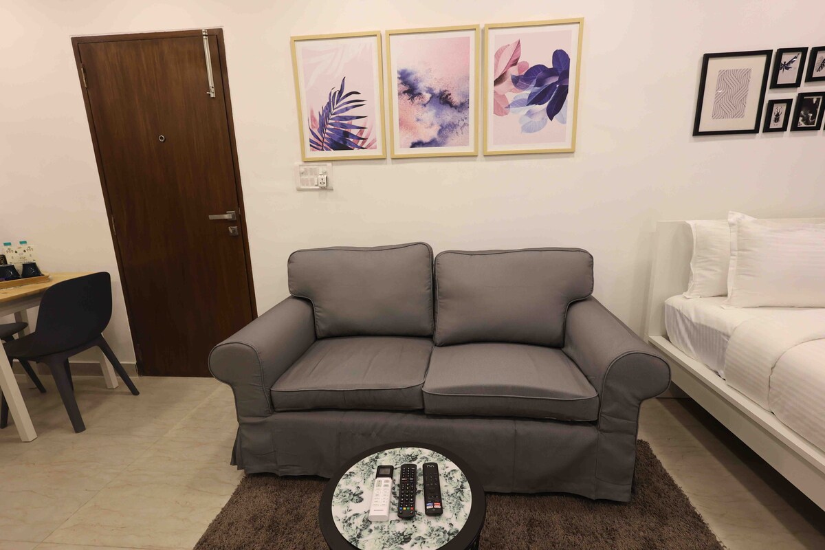 Alójate de lujo en nuestro apartamento de 1BHK totalmente amueblado, que ofrece un dormitorio acogedor, dos baños (un dormitorio adjunto, uno común ) y una cocina totalmente funcional con electrodomésticos y utensilios de cocina básicos. Relájate en la amplia sala de estar con un televisor inteligente grande y un elegante diseño interior. Disfruta de muebles de alta gama que crean un hogar lejos de casa. Perfecto tanto para estancias cortas como largas, este apartamento promete comodidad y conveniencia en una ubicación privilegiada en la ciudad. ¡Reserva ahora y disfruta de una estadía excepcional!