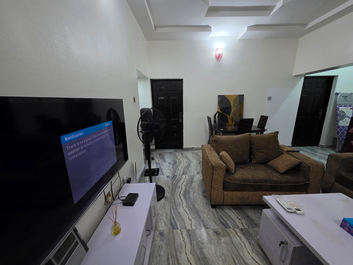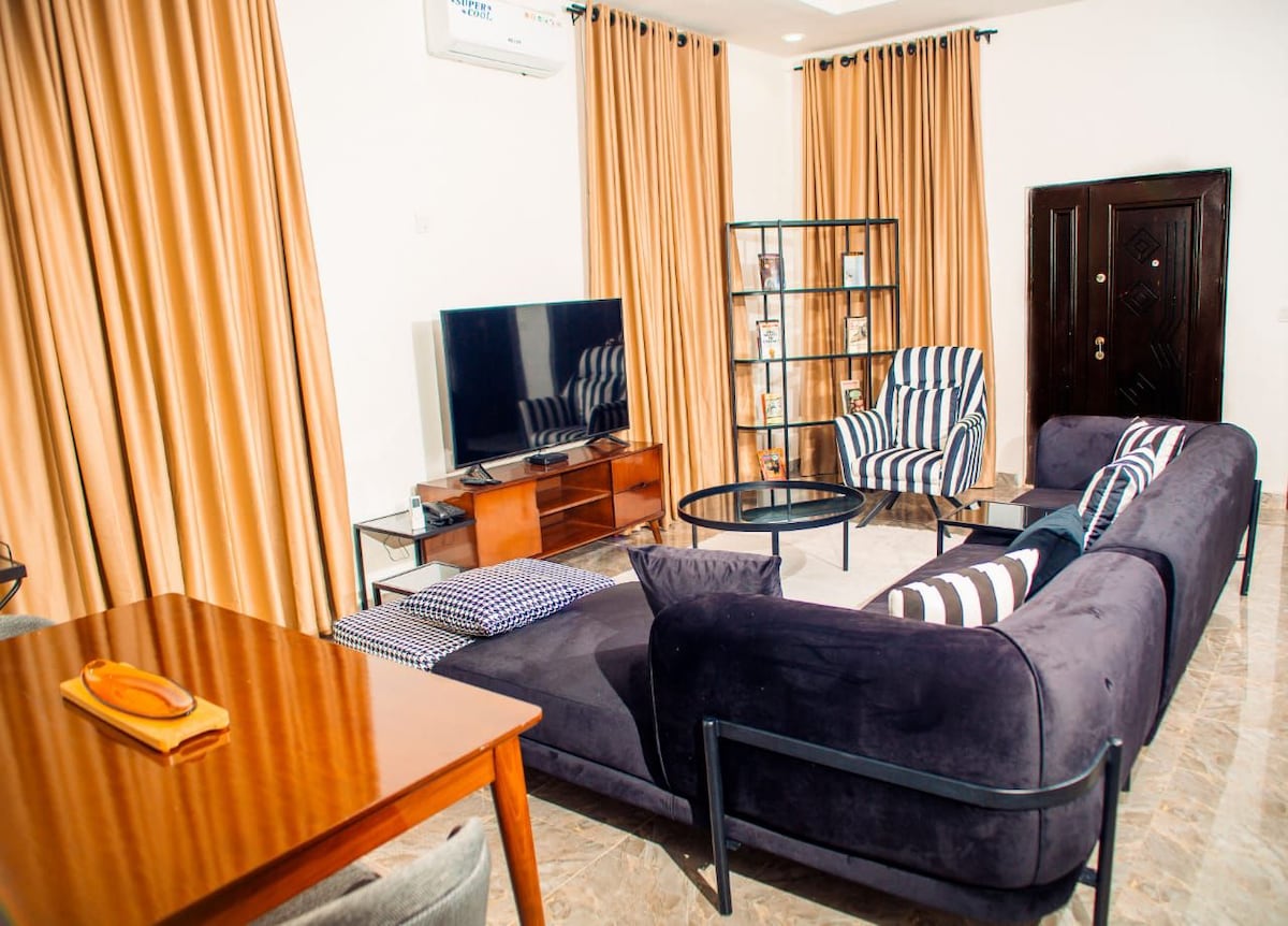 La casa Prestige ofrece 1 dormitorio, pero el segundo dormitorio se puede desbloquear para 1 huésped más o 2 adolescentes con tarifas adicionales. Crea recuerdos en este lugar único y familiar en Kano. Si necesitas un lugar único para alojarte y aún así sentirte como en casa Disfruta de una fuente de alimentación 24/7 alimentada por inversor y generador. Cocina equipada Lavadora Sala de estar/comedor con televisor inteligente. Estación de trabajo con monitor LED e impresora Horno microondas. Refrigerador Cocina de gas de 4 quemadores con horno BR1 tiene cama tamaño king; BR2 tiene una cama tamaño queen.