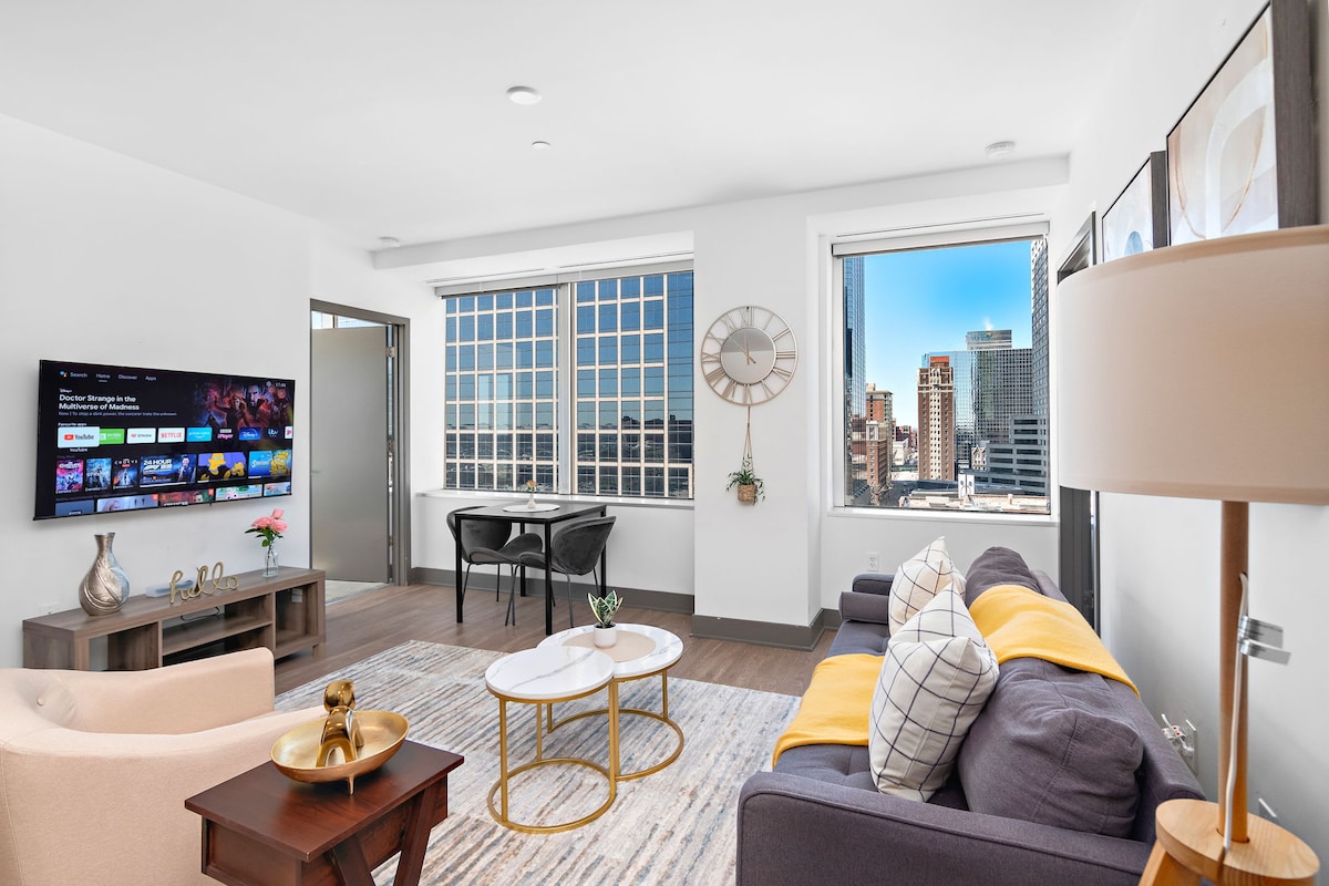 Stay in the heart of Kansas City.. right Downtown! This spacious, beautifully decorated apartment offers stunning city views from every window. Walking distance to top attractions like the Power & Light District, River Market, and Bartle Hall Convention Center. Fully furnished with modern decor, stocked kitchen, and on-site laundry. Enjoy the convenience of a FREE parking spot—a rare downtown perk! Perfect for business or leisure, experience the best of KC right outside your door.