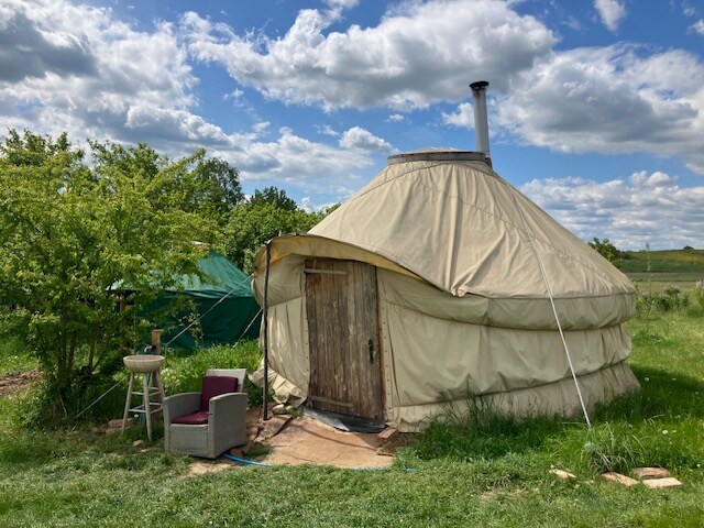 Aquí arriba, desde la colina, puedes ver los campos y los prados y experimentar cada estación desde el amanecer hasta el atardecer: puedes asar a la parrilla, hacer fogatas y tomar un baño caliente bajo el cielo estrellado. En el interior, puedes disfrutar de la calidez del horno y la luminosa habitación redonda con una cómoda cama doble, minicocina, electricidad y agua corriente justo afuera de la puerta. Tal vez haya muchas verduras y frutas en este momento, todo aquí es orgánico. Pregunta si eso te atrae, te venderemos algo.