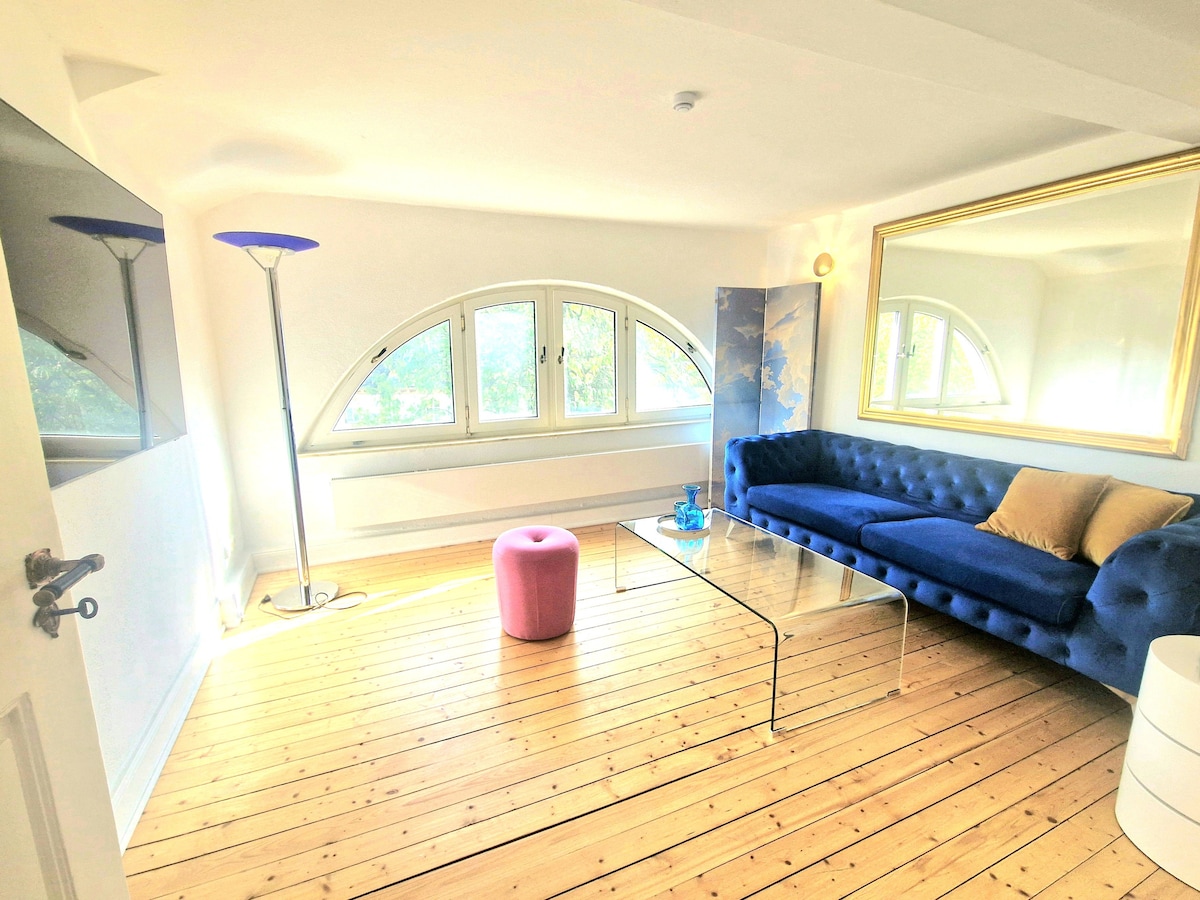 ¡El apartamento donde te sientes como en casa! El departamento cuenta con techos altos, ventanas grandes y una amplia cocina con comedor. Sala de estar con TV inteligente, sofá, escritorio grande con dos monitores. La cómoda cama tamaño queen se encuentra en el segundo nivel (escaleras empinadas), y hay un sofá cama (140 cm, con colchón). Baño con ducha/WC, lavadora y secadora. Amplio balcón con plantas, barbacoa (hidromasaje actualmente fuera de servicio). Estacionamiento en la calle disponible.