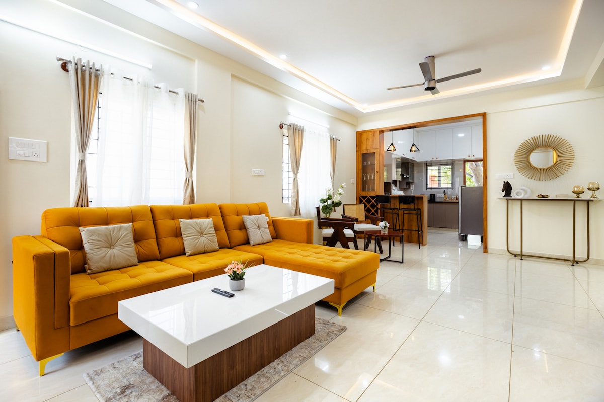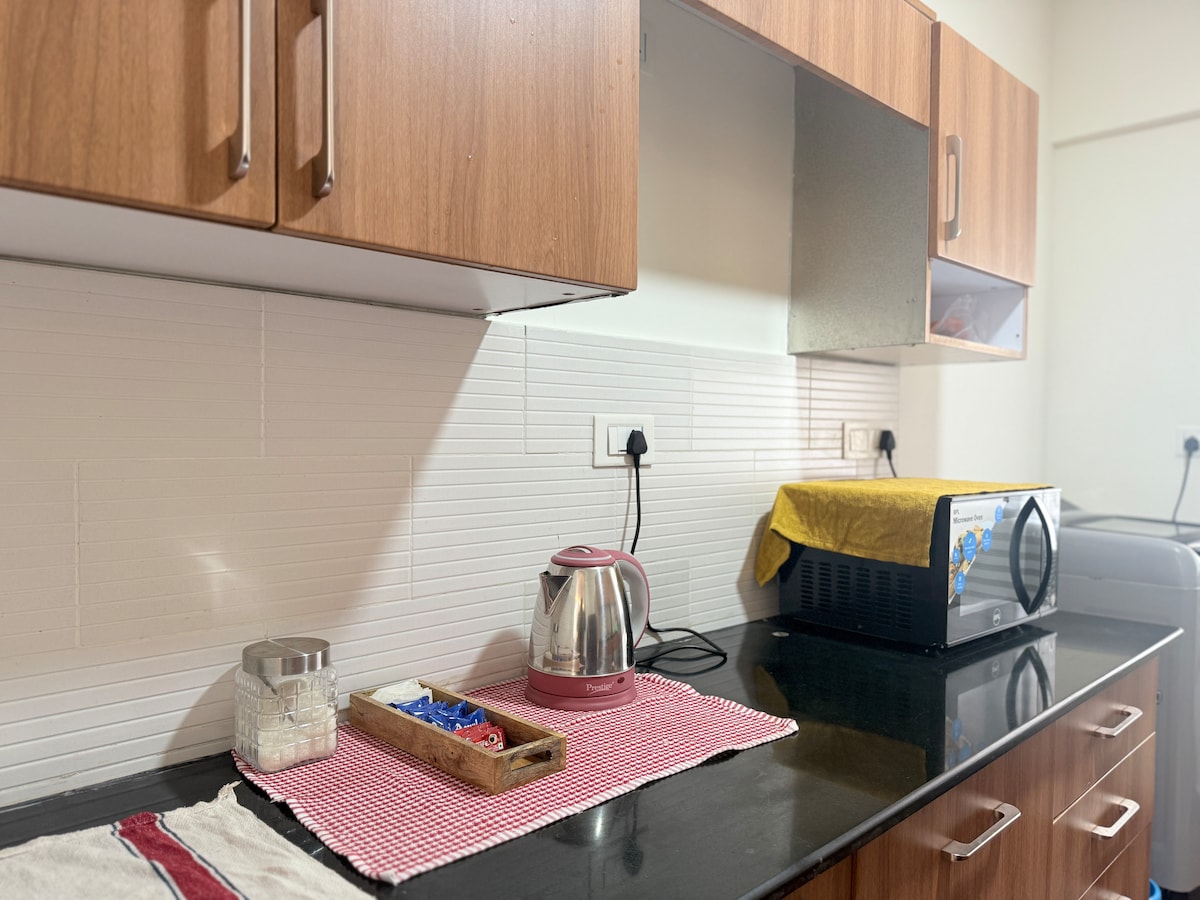 Amplia suite 1BHK de diseño de 600 pies cuadrados con balcón privado | Wifi de fibra óptica de alta velocidad y TV inteligente con plataformas de streaming, escritorio de trabajo/comedor, respaldo de energía las 24 horas, los 7 días de la semana para trabajo y comodidad ininterrumpidos | Cama tamaño king Luxe y colchón ortopédico, armarios de madera para almacenamiento | Cocina pequeña totalmente equipada | Sofá cama en la sala de estar , ocupación máxima 4 | Acceso al ascensor, servicio de limpieza profesional y acceso a lavandería de pago en el sitio para estancias largas | Ubicado en el centro de Bangalore | LGBTQIA++ Afirmativo