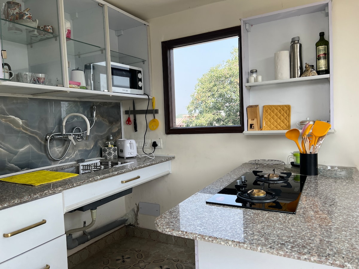 El Serene Apartment 2 está ubicado en la elegante localidad GK-1 del sur de Delhi, muy cerca de 3 estaciones de metro y tiendas de conveniencia. Ubicado justo al lado de enormes parques con muchos árboles. El departamento cuenta con amplia luz natural y ventilación. El lugar está recién hecho con estilo moderno, está en el segundo piso con acceso a la escalera solamente, se proporciona ayuda con el equipaje. Hay 2 dormitorios con baño privado + cocina totalmente equipada. La sala de estar tiene un sofá cama grande con baño privado.