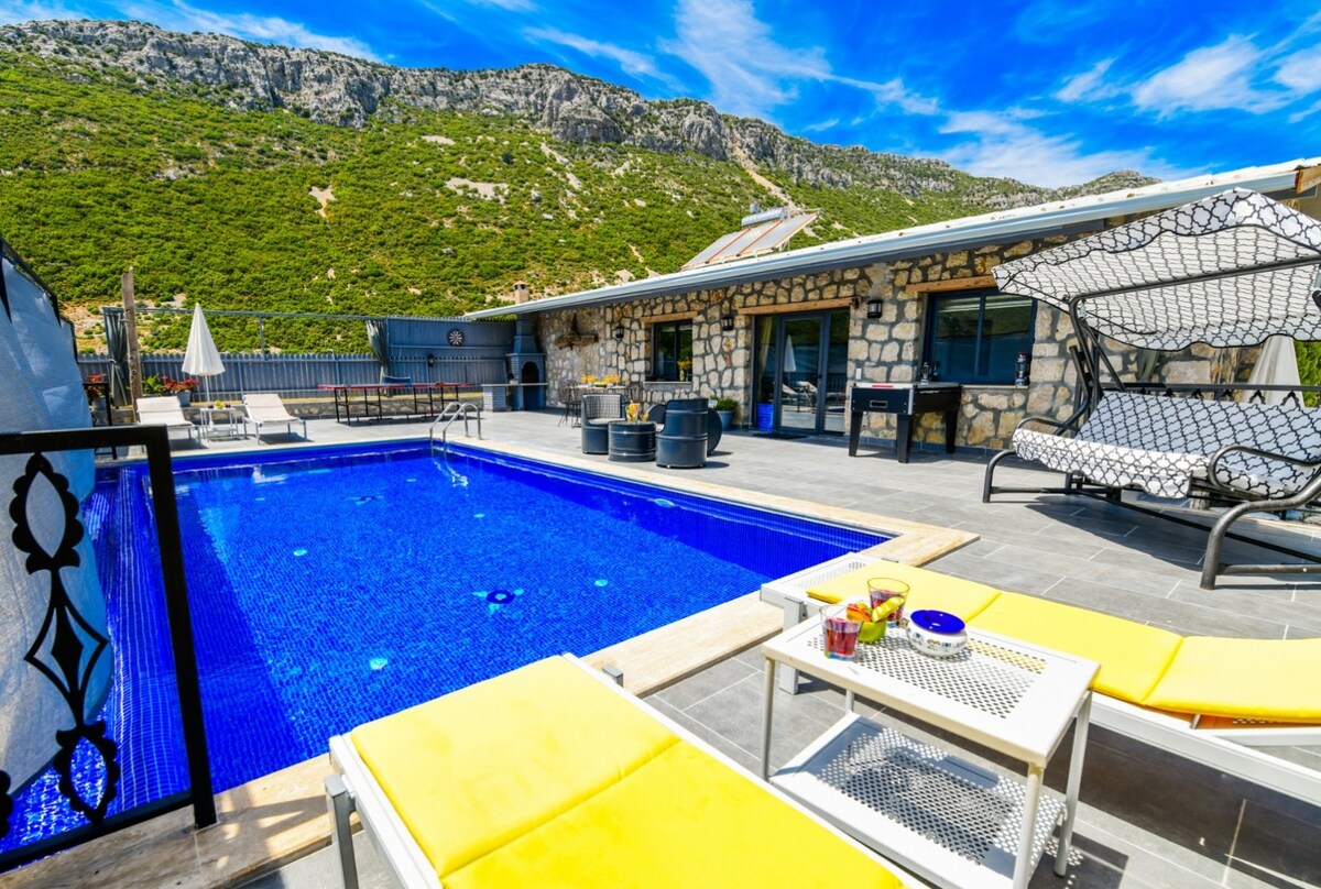 Kalkan Bezirgan mevkiinde konumlu 2 yatak odalı 4 kişi konaklama kapasitesine sahip kiralık villadır. Her bir ayrıntısı sizler için düşünülüp özenle hazırlanan villamızda tüm yılın yorgunluğunu atarken aynı zamanda havuz teras alanında bulunan masa tenis ve langırt ile sevdikleriniz ile eğlenceli vakit geçirebilirsiniz.
