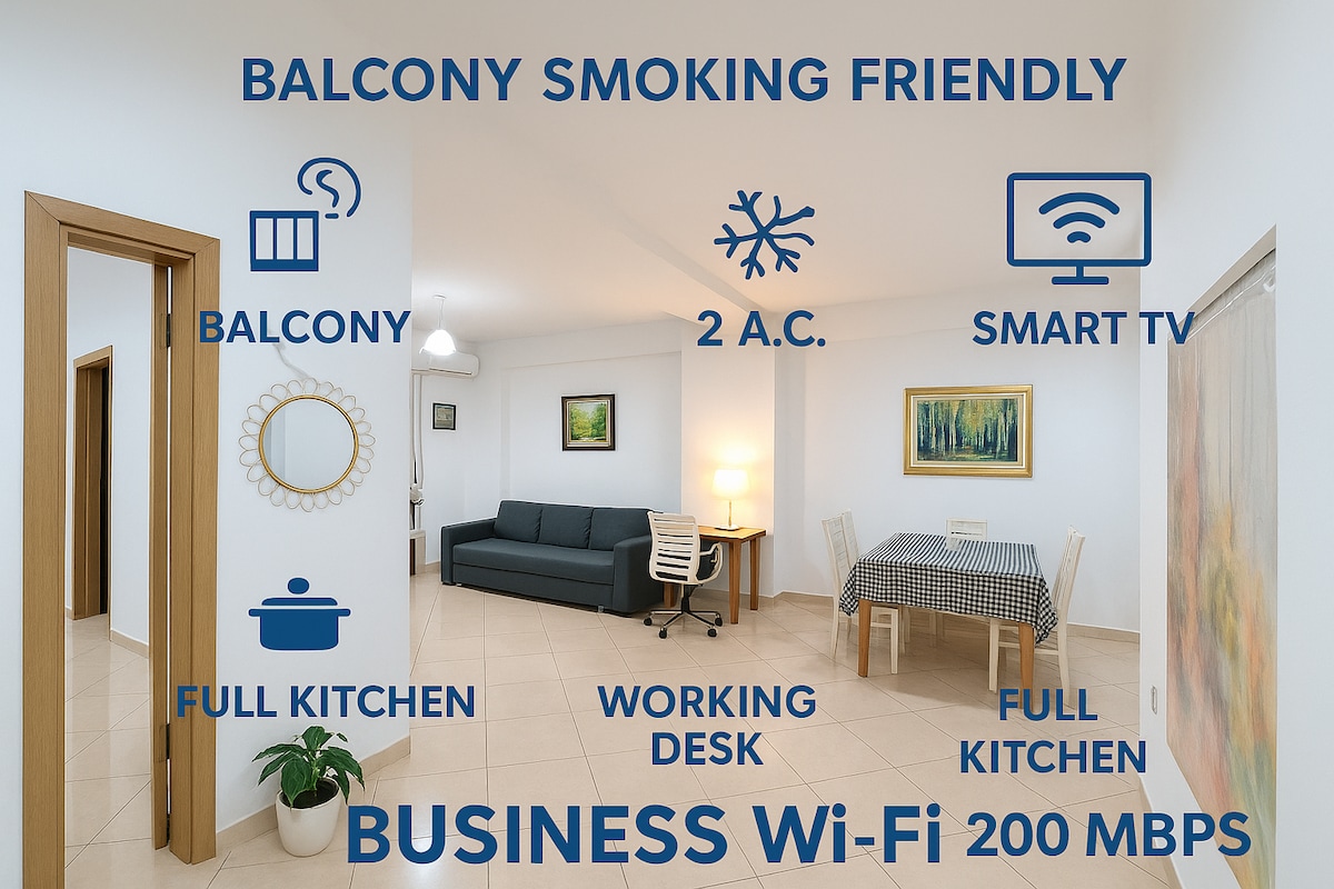 68 M2 apartment. 2 High-Quality A.C, Bedroom&Living Room. Fiber Optic Business WIFI 200 MBPS/50 Smart tv youtube&Netflix Double glazed windows soundproofing and thermal insulated windows Big Balcony (Smoking Friendly) Bedroom with A.C and queen bed Washing Machine. One sofa bed in the living room. 1 Queen bed, One sofa bed We provide professional cleaning our highest priority Supermarkets, Restaurants, Barbier, Bakery and Gym 2 minutes on foot. Coffee,Tea,Oil, Sugar&Spices.