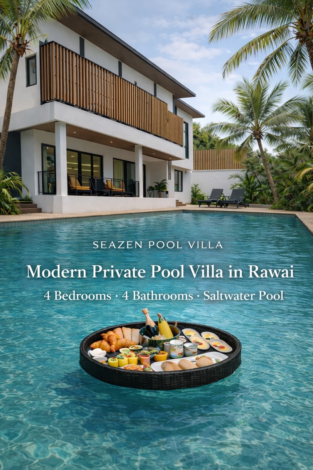 Escápate al refugio de tus sueños en nuestra lujosa villa de 4 dormitorios, con una impresionante piscina de agua salada, complementada por una zona de playa perfecta para los niños. Situada a solo 5 minutos de las playas de Rawai y Nai Harn, esta moderna villa se encuentra en una residencia privada y tranquila cerca de tiendas, donde puedes encontrar restaurantes, supermercados y masajes. Ideal para familias o amigos que buscan relajación, ofrece una mezcla perfecta de lujo y comodidad. ¡Tu ideal empieza aquí!