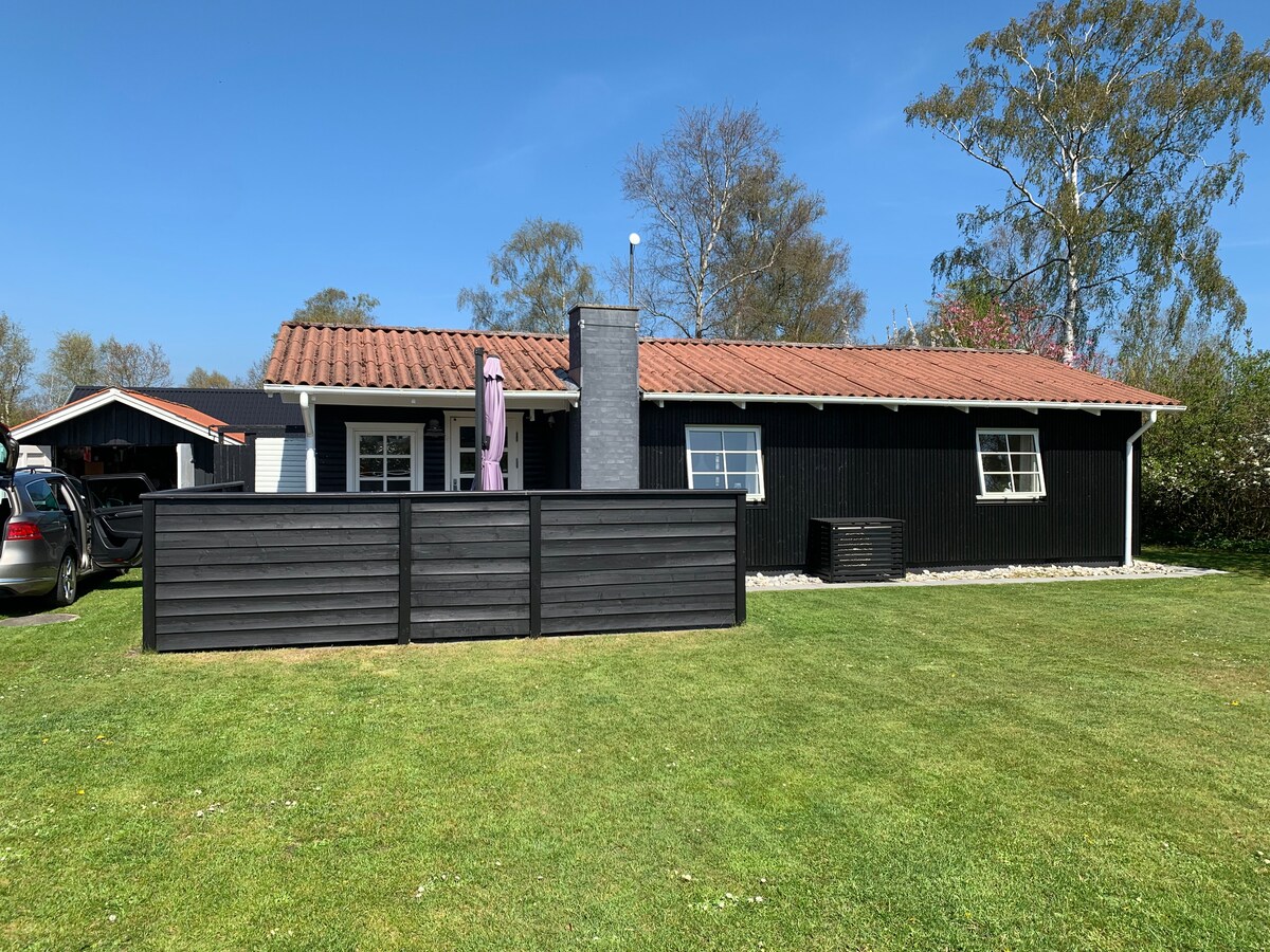 Nueva casa de campo de lujo de 115 m2, con 80 m a playa apta para niños. 3 dormitorios grandes. y 2 bonitos baños. Salón grande de 50 m2 que contiene cocina con lavabo/lavavajillas, mesa de comedor con espacio para 10 personas, acogedora zona de estar, estufa de leña y gran loft con vistas al mar. La sección de invitados tiene su propia entrada y baño. En el exterior hay una gran terraza con refugio y sol/luz desde la mañana hasta la noche. La casa está en una zona de campo densa y acogedora. Perfecto para 3 generaciones o dos amigos con niños