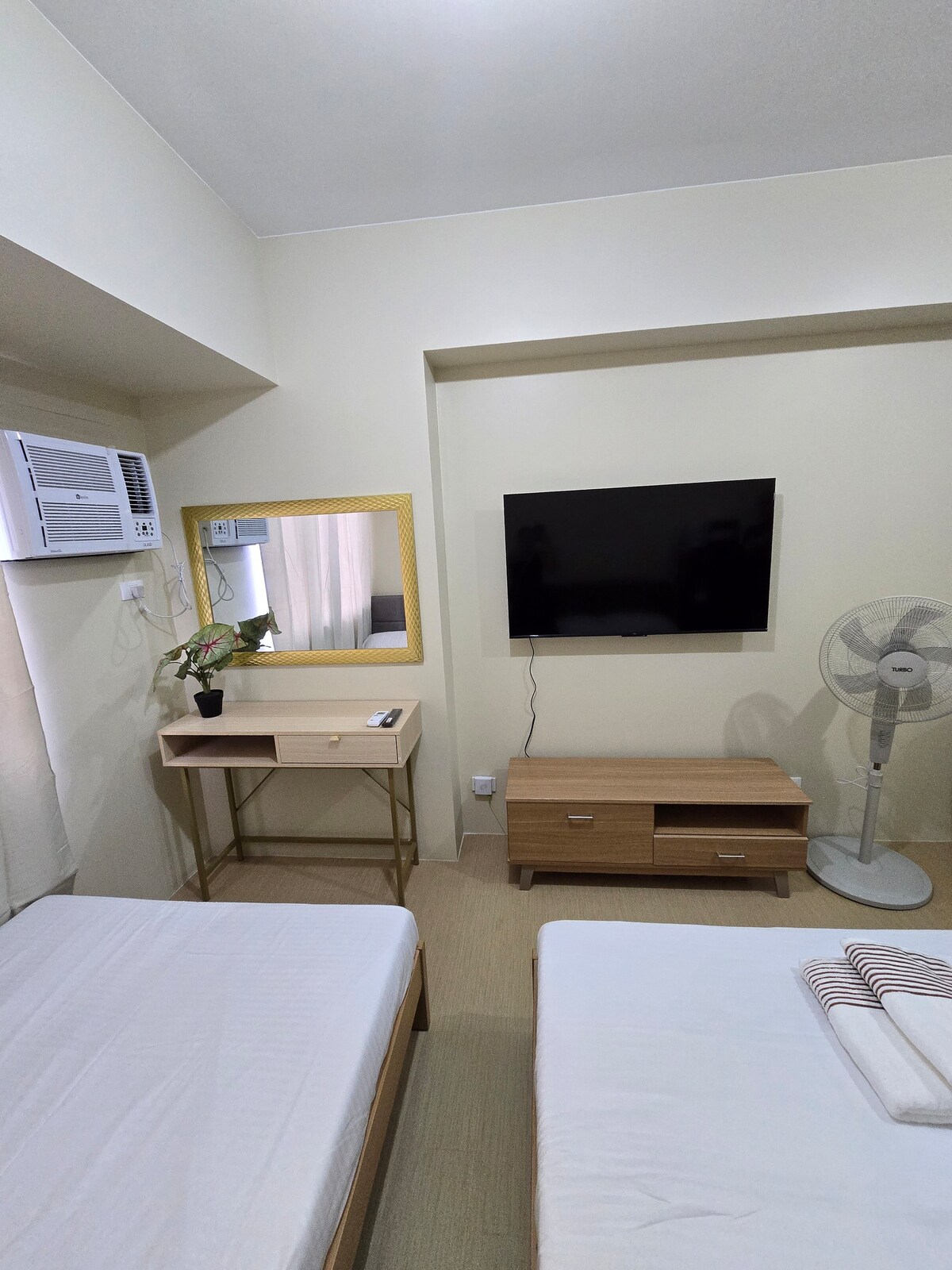 Ideal para familias de 4 ¡Nuestra unidad de un dormitorio recién inaugurada ya está abierta para huéspedes! Apartamento de un dormitorio. La habitación está equipada con lo siguiente: * Cama tamaño queen * Sofá cama (2 plazas) * 2 aires acondicionados divididos * Smart TV (con Netflix) de 55 pulgadas * Armario enorme para ropa *Microondas * Wifi *refrigerador * Arrocera * Cocina de inducción * Utensilios de cocina y comedor * Mesa de comedor * Sofá * Ducha fría y caliente Las comodidades incluyen: * Piscina. * Gimnasio * 2 tiendas 7/11 (1 abre las 24 horas; 1 abre hasta las 23:00 h)