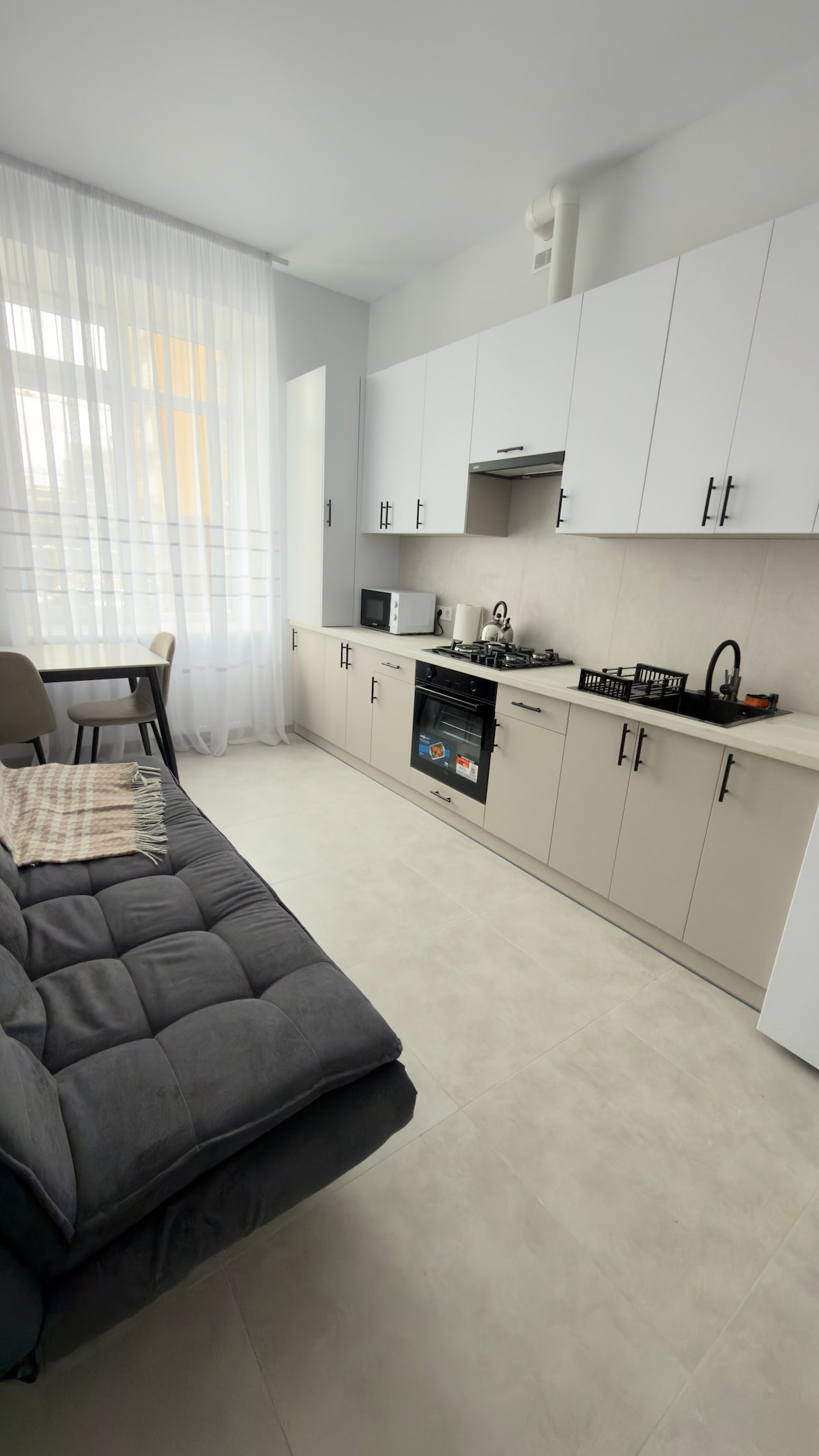 Насолодіться стильною атмосферою цього помешкання в центрі міста. Апартаменти з продуманим плануванням: • перший поверх, вхід з вулиці, • дитяче приставне ліжечко для найменших гостей, • комфортна зона відпочинку (велике ліжко та диван), • кухня з технікою (холодильник, мікрохвильова, плита, чайник, кавомашина), • обідній стіл та зручні стільці, • пральна та сушильна машини, • опалення кондиціонером, • стильний та сучасний інтер’єр. 📍 Центр міста, поруч магазини, кафе та транспорт.