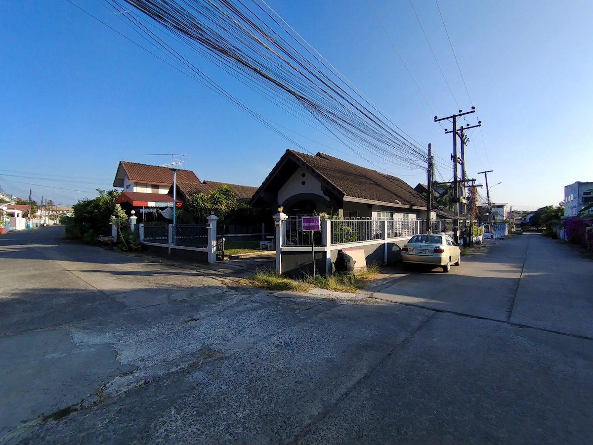 Casa adosada de 2 dormitorios y 1,5 baños cerca del hospital srinakarin con un ambiente moderno y espacio al aire libre. Todas las comodidades disponibles, incluyendo aire acondicionado estufa de gas refrigerador superior y agua corriente, así como ducha con agua caliente. Disfruta de tu estancia en nuestra encantadora ciudad con muchas tiendas y entretenimiento cerca. Además de experimentar la cultura tailandesa y la comida a pocos pasos. A poca distancia en coche del aeropuerto y del centro comercial cerca de la universidad. Niños y mascotas amablemente bienvenidos.