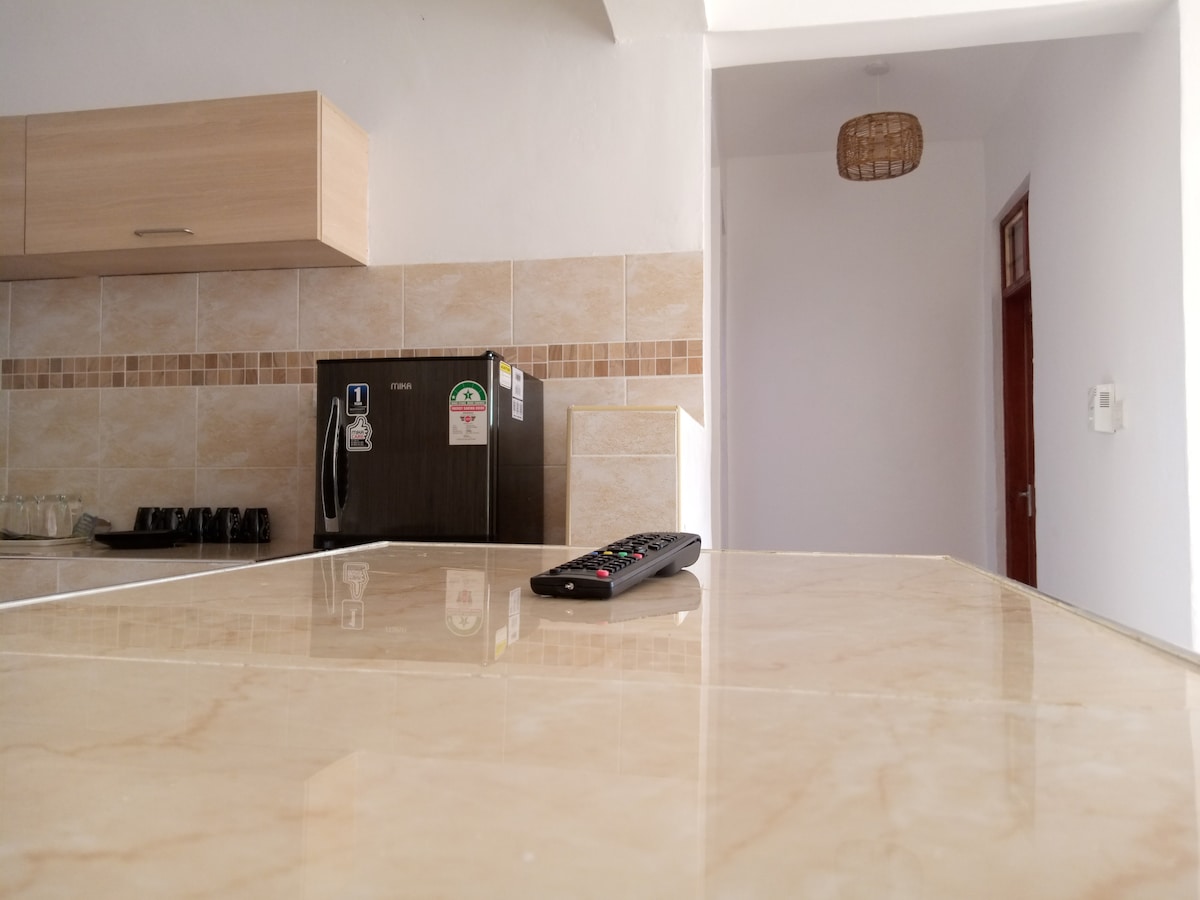 Acogedor apartamento estudio con servicios (Bamburi) amueblado. * Adecuado para 2 adultos y 1 niño o 3 adultos, amueblado con una cama tamaño queen y una cama individual. * Incluye aseo diario. * Mesa de comedor con cuatro sillas, sofá, mesa de centro. * Aire acondicionado *TV * Caja fuerte con llave * Balcón con dos sillas y mesa de centro * Cocina: nevera, microondas, hervidor de agua, cafetera, tostadora, vajilla y cubiertos. * Acceso a servicios: piscina, zona de juegos para niños, bar de playa, restaurante, gimnasio, playa, lavandería. * A 21 km del aeropuerto internacional de Moi. * A 26 km de SGR Mombasa.