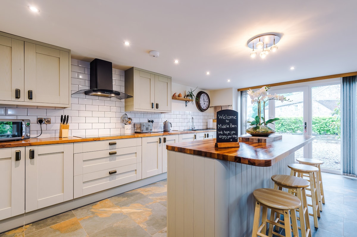 Renovada con cariño por mi marido y por mí, la propiedad se encuentra perfectamente dentro de su entorno rural y rezuma la clase de una nueva construcción, al tiempo que conserva el encanto eduardiano del granero original. Situada junto a un carril privado en un encantador pueblo en el límite de los páramos de Staffordshire, la propiedad se encuentra a poca distancia en coche del centro vacacional Alton Towers, el lugar para celebrar bodas Foxtail Barns, el distrito de Derbyshire Peak y la histórica ciudad del condado de Stafford.