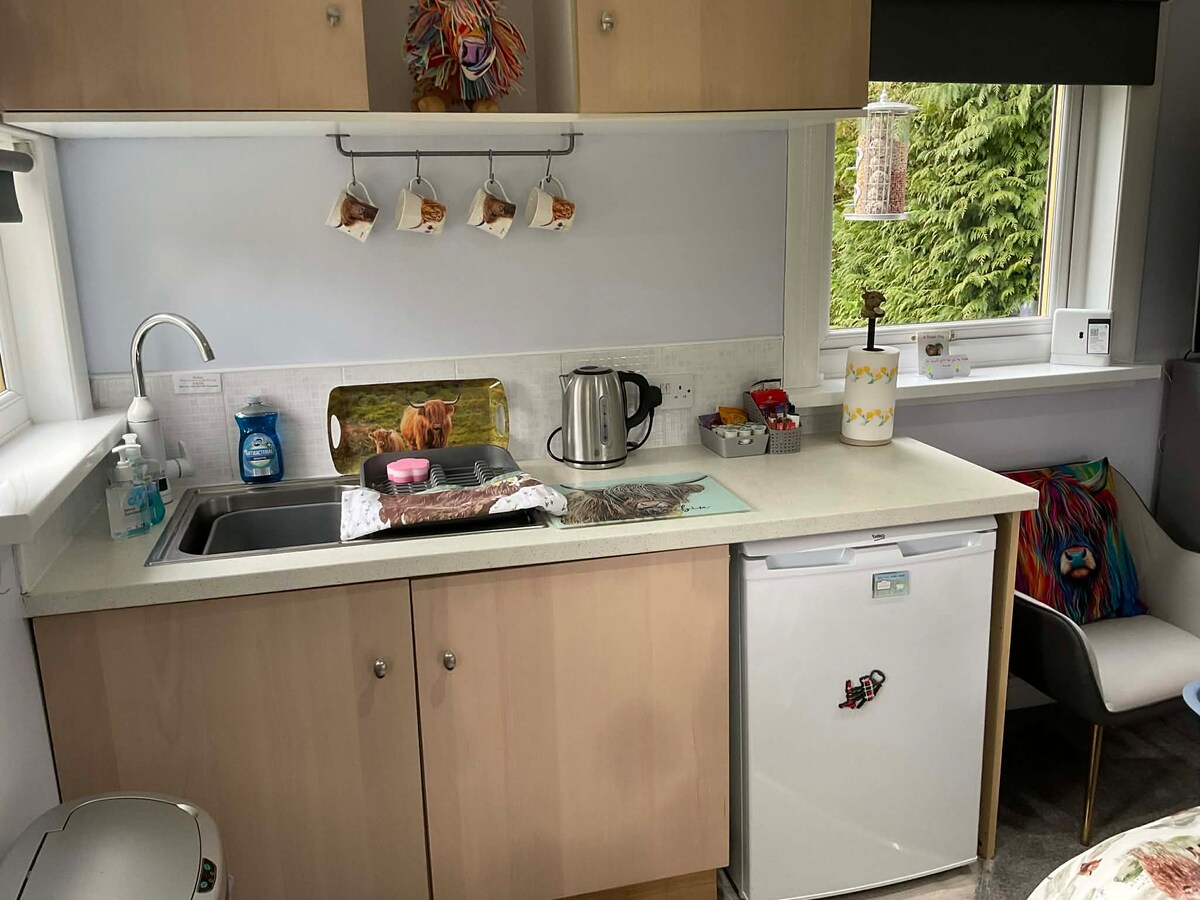 Ven y relájate en la acogedora cabaña en una ubicación tranquila con amigables vacas de las tierras altas como vecinas. Un espacio independiente con cocina americana y cuarto de ducha. La cocina americana incluye un fregadero, nevera, hervidor de agua, tostadora y microondas. Ten en cuenta que no hay horno ni placa de cocción. Hay platos, tazas, vasos y cubiertos. Hay banda ancha y televisión Freesat. Encontrarás un perchero y una cómoda para guardar cosas. La cabaña se encuentra en una zona separada de la propiedad con su propio jardín/patio privado. Hay aparcamiento disponible.