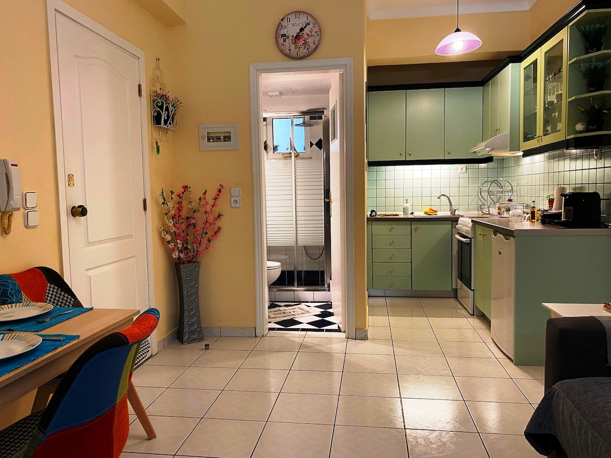 Te presento mi encantador y colorido departamento, ubicado en el centro de la ciudad de Chania. A solo 10 minutos a pie del casco antiguo y a 7 minutos de la estación central de autobuses, pero ubicado en un vecindario tranquilo, es el lugar ideal para relajarse y explorar Creta :)