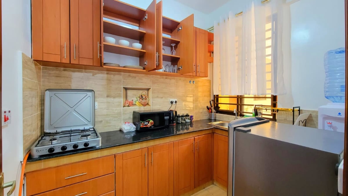 Two-bedroom apartment in a serene and secure neighborhood of Kisumu. It is conveniently located within walking distance to public transport, shopping malls, markets, and places of worship. Tastefully furnished for your comfort with a maximum capacity of five people; it is the perfect place to stay on holiday or business, for family or individual trips, short or long-stays.