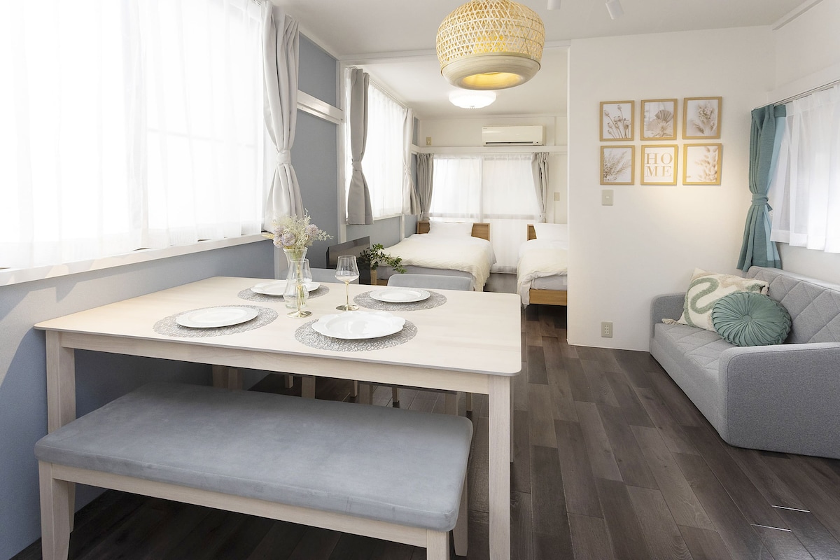 Acerca de 🏠SAKAE HOUSE Casa independiente en el tercer piso, dormitorio 3, recién remodelado, entero Primer piso: sala de estar, sofá cama para 3 personas, mesa para 8 personas, mesa baja, TV (películas gratis, programas de TV), Wi-Fi de alta velocidad, cocina, nevera, microondas, horno tostador, agua caliente, utensilios de cocina, condimentos Ducha X2 Suministros de ducha Secadora de pelo X2 Lavadora detergente para ropa Aspiradora Sin cepillo de dientes Segundo piso: 2 habitaciones de tatami de estilo japonés de 13,02 metros cuadrados y un futón de 8,51 metros cuadrados, conjunto de 7 espacios de almacenamiento, cortina opaca con inodoro, lavabo. 3er piso: habitación de estilo occidental 160 cm × 200 cm cama doble x 2, espacio de almacenamiento, cortinas opacas, inodoro (alcohol desinfectante en el asiento del inodoro), balcón, tendedero Elegimos cuidadosamente cada mueble, ropa de cama, etc. para que nosotros mismos los usemos, para que podamos proporcionar una casa de vacaciones relajante y cómoda para amigos y familiares. Esperamos conocer a amigos de todo el mundo y esperamos que los niños y los adultos disfruten de un viaje divertido donde puedan caerse, jugar y reír mientras se curan con el aroma de la hierba natural en las alfombrillas de tatami.