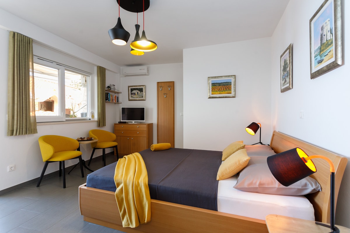 El apartamento está en una casa de piedra a solo 150 metros de las murallas de la ciudad... a 3 minutos a pie... Los apartamentos están a SOLO 40 METROS SOBRE EL NIVEL DEL MAR y justo enfrente de la playa más popular de la ciudad, Banje. Este apartamento ahora está actualizado en un alojamiento de 1 habitación de primera categoría: una cama francesa y un sofá cama en la esquina. Para la temporada 2023 y posteriores, tendrá capacidad para hasta 3 personas. Calidad de primera categoría, habitación grande, cocina y baño cómodos y modernos, aire acondicionado nuevo.