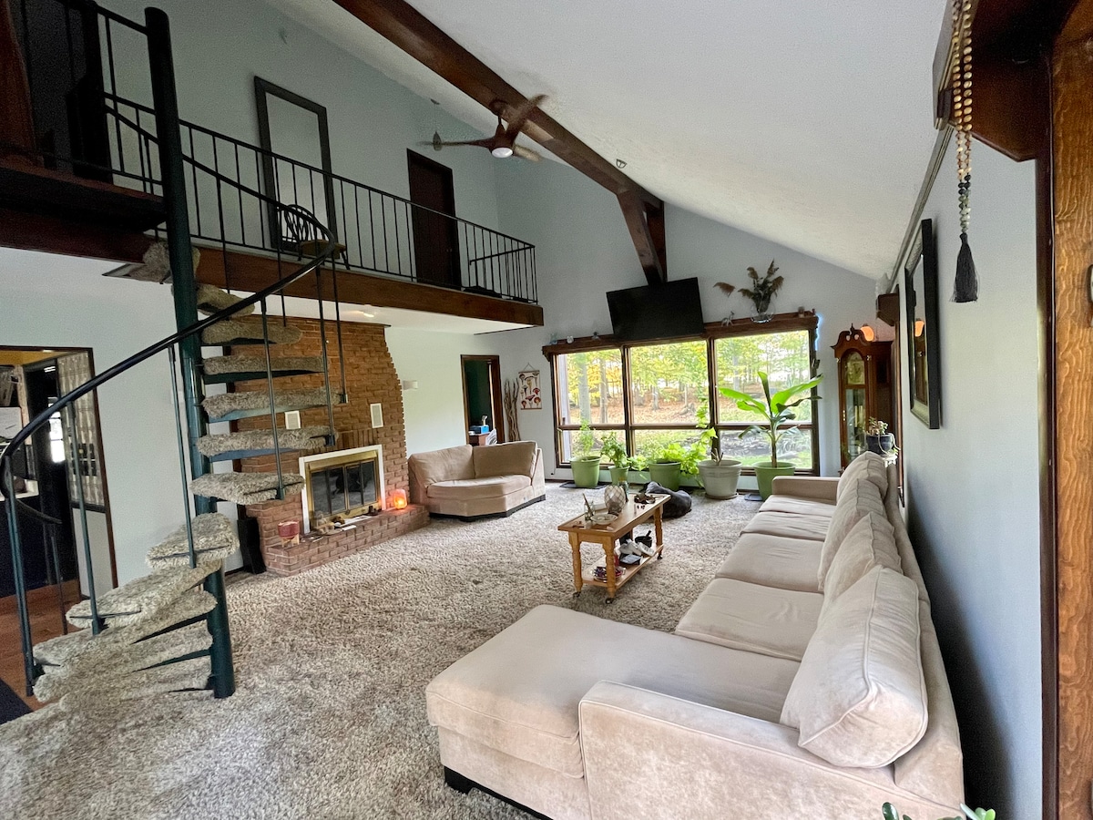 Our Rustic Frank Lloyd Wright inspired contemporary home is located on 10 wooded acres amidst nature's beauty. There are trails in the woods for hiking & cross country skiing. The floor to ceiling walls of glass in the apartment bring the outside in and the private deck provides additional spectacular views of the woods. When not enjoying the wonders of the outdoors, take advantage of our included streaming services. We have a brand new heating and cooling system with 24/7 service!