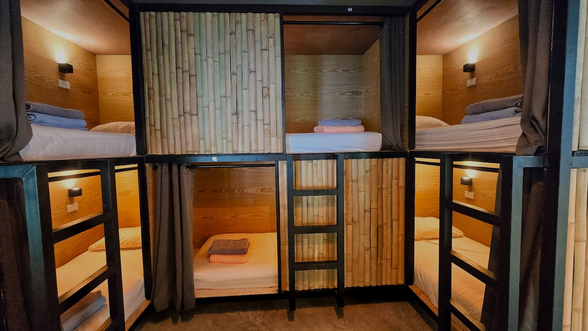 Hostel with shared accommodations in container-style rooms. A total of 12 rooms with 96 beds in total. Each room has 8 bunk beds (2-tier). Shared bathrooms with separate facilities for male and female guests. Laundry and ironing services available for an additional fee. Centrally located on Chaweng Beach, just a 10-minute drive from the airport. Open-air swimming pool available. Private beach area, just a 5-minute walk away from the sea. Cocktail bar (Tiki Box Bar Samui).