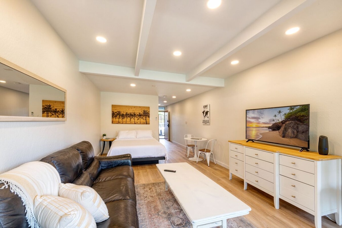 ¡NUEVA remodelación de cocina, nuevos suelos y pintura! LIMPIEZA profesional. Cama tamaño king Sealy de felpa, todos los armarios de cocina y baño nuevos, electrodomésticos de acero inoxidable, lavadora secadora de tamaño completo, azulejos y suelos de LV en todas partes. Hermosos muebles, obras de arte en todas partes, encimeras de granito, ropa de cama de alta gama, sofá cama tamaño queen con colchón de ESPUMA de 5 pulgadas. Después de la playa, relájate y disfruta de una bebida y descansa en tu lanai privado con vistas a los jardines tropicales. Unidades de aire acondicionado tanto en la sala de estar como en el dormitorio.
