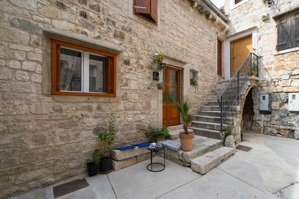 Nuestro encantador y acogedor apartamento de un dormitorio se encuentra en la planta baja de la casa de cien años en la tranquila calle a unos 30 metros del mar. Patio con sillas de madera y mesa cubierta con árbol de uva silvestre es la verdadera zona de frío.